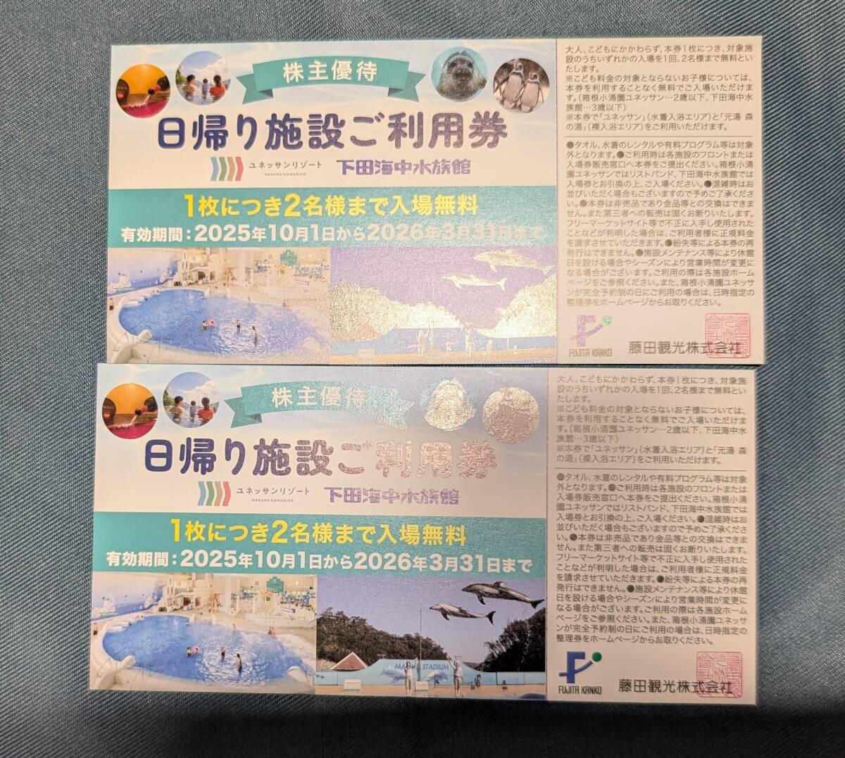 ☆★藤田観光 株主優待 日帰り施設ご利用券 2枚・箱根小涌園ユネッサンリゾート 下田海中水族館【送料無料】★☆ | |||