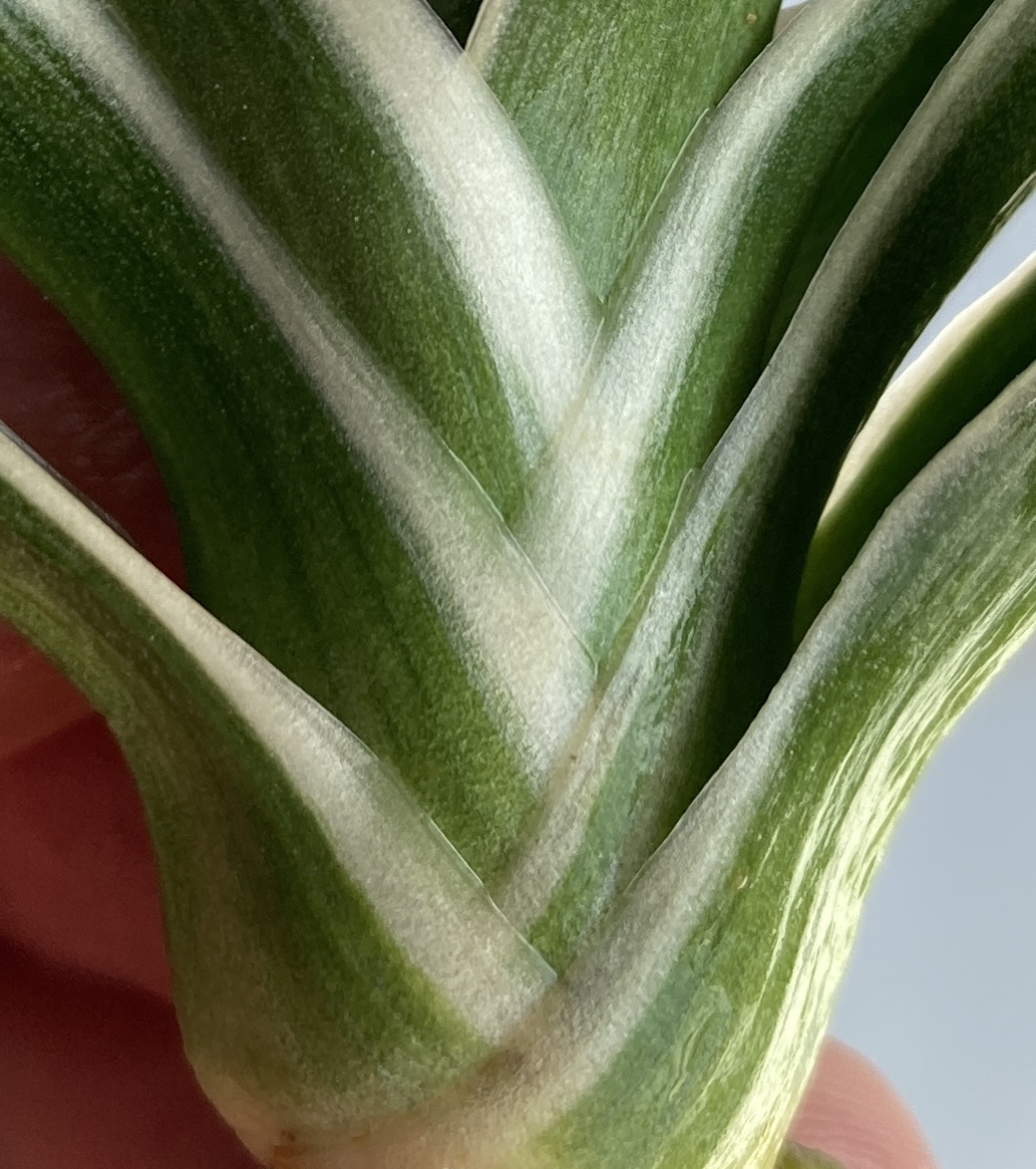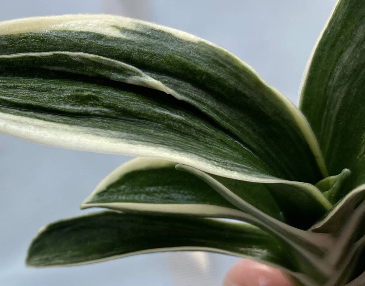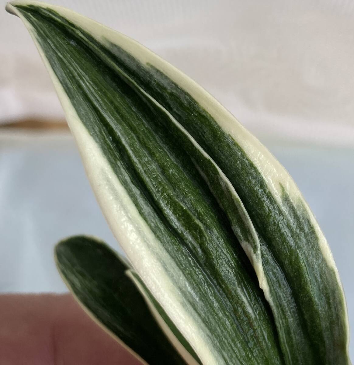 万年青の名品、八紘錦です。いわゆる育てやすい入門品種としては、間違いなくトップクラスの芸を出します。是非、インターネットで調べてみてください。最近の高級品種にも負けない芸です。