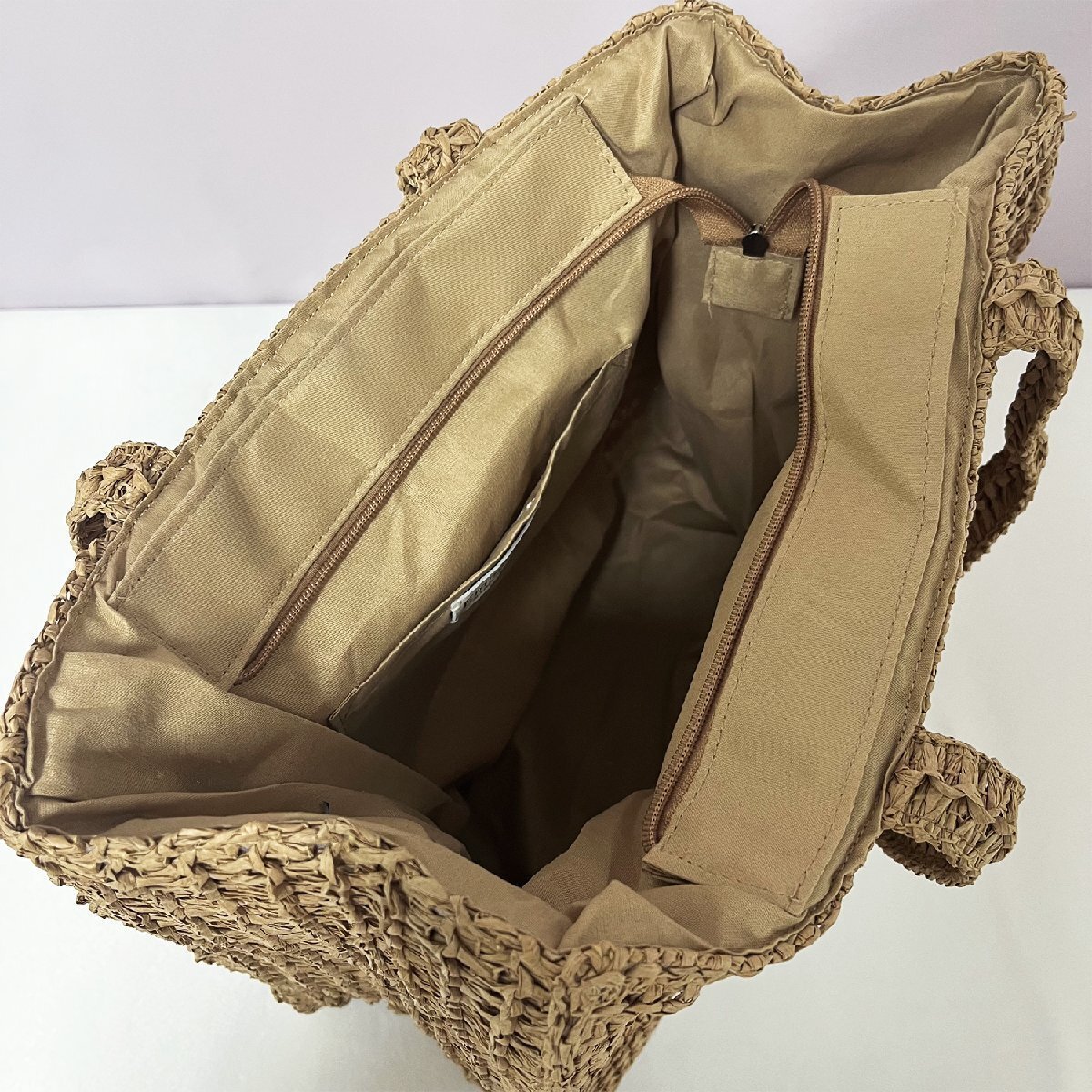 裏地は布張りなので外から中が透けて見えず安心です。中間はファスナー仕様で、内側にはスリップポケット1つがあり、スマホ、長財布、ポーチ、500mlボトルなどお出かけにぴったりなサイズです。