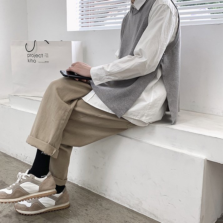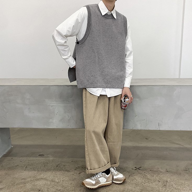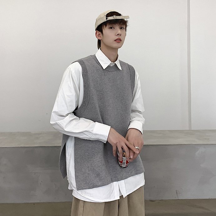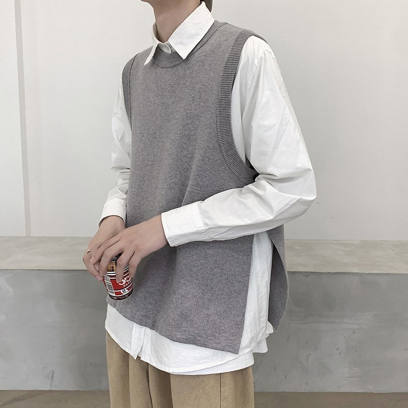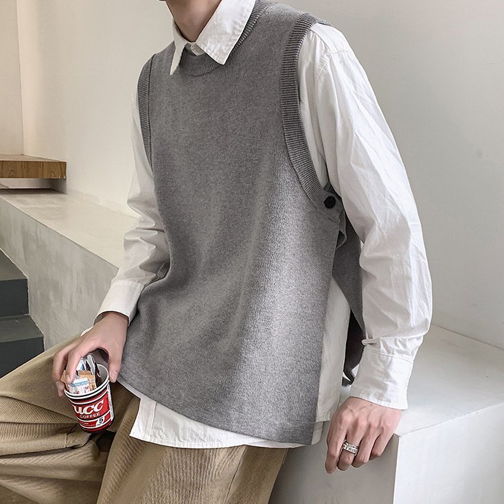 メンズ ニット クルーネック ベスト おしゃれ カジュアル セーター 長袖 オフィス グレー2XL