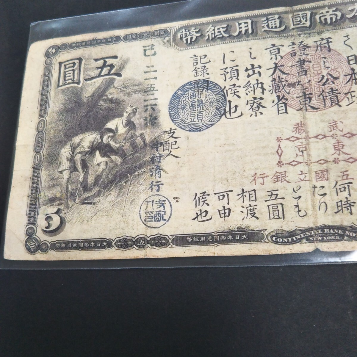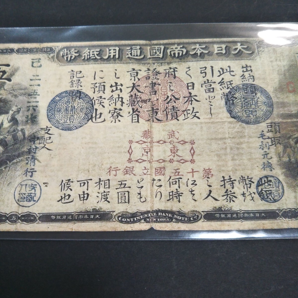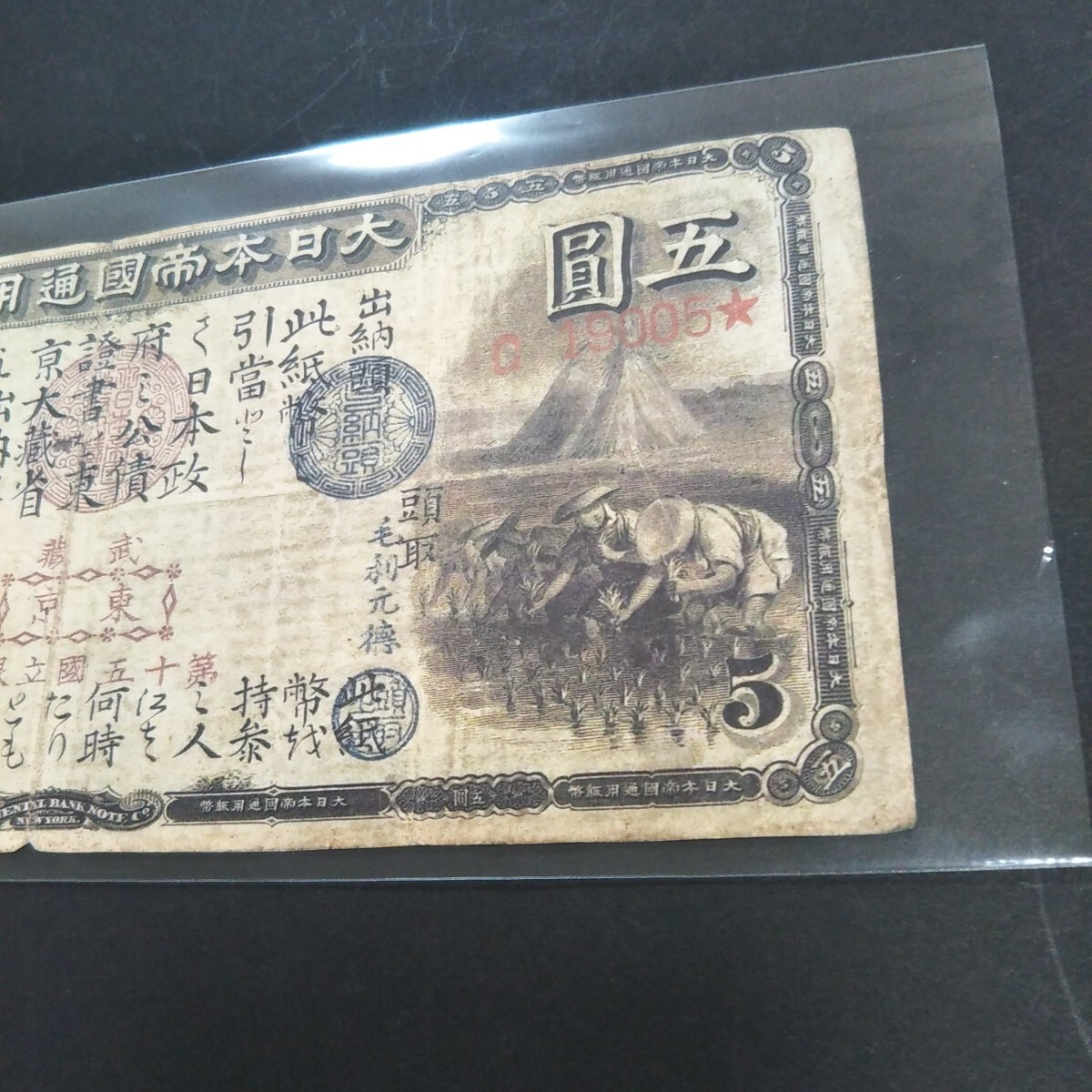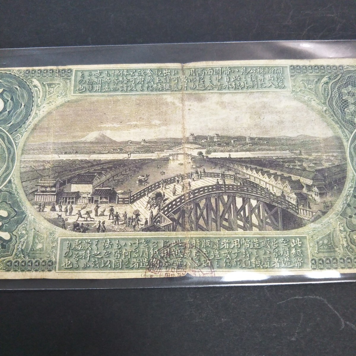 旧国立銀行券5円 日本橋と富士の遠景 田植えと稲刈り  古紙幣 旧紙幣 アンティーク コレクション 旧札 古銭