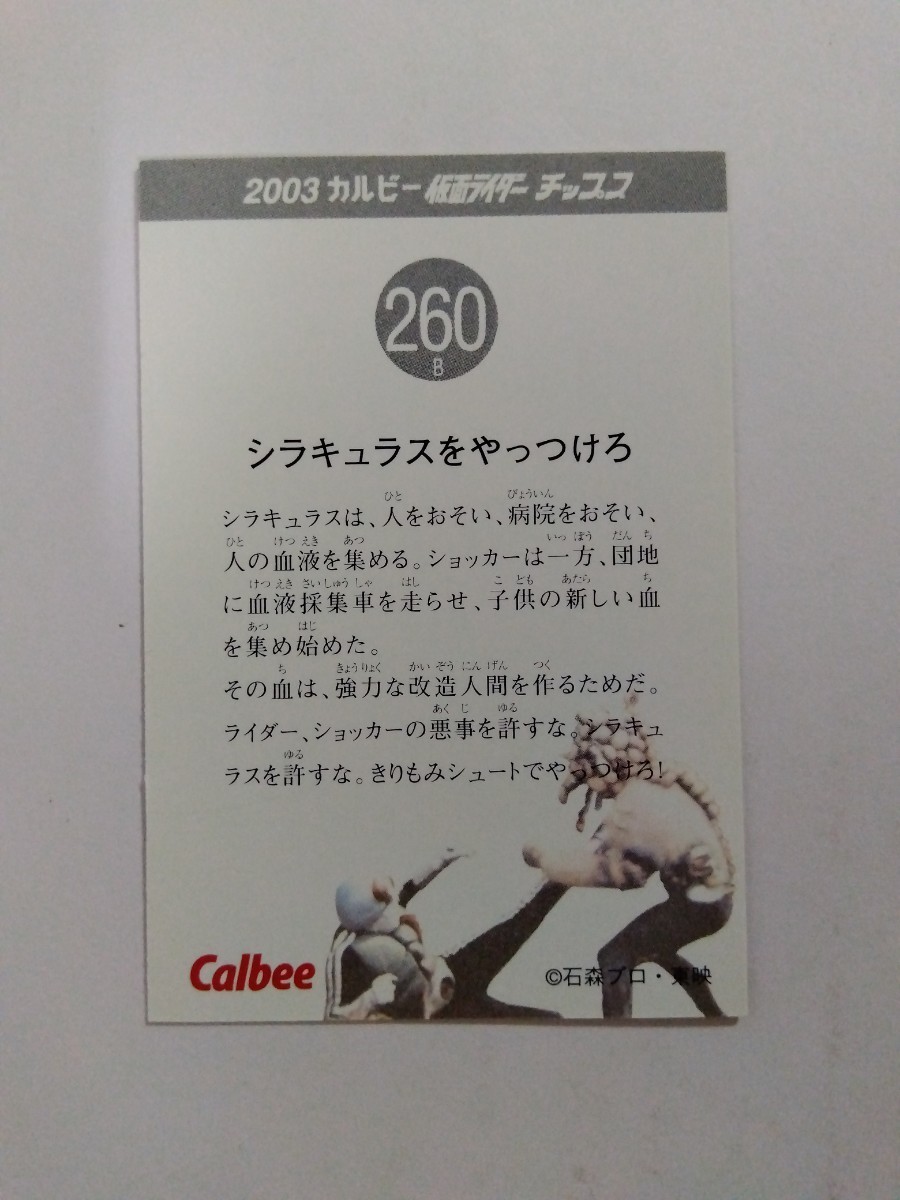 2003年仮面ライダーチップスは1971 年に発売された仮面ライダースナックの復刻版です。カードは、1999 年に販売された1〜216番の続きで、1期(217〜326番)、2期(327〜436番)、3期(437〜546番)に分けて販売されました。