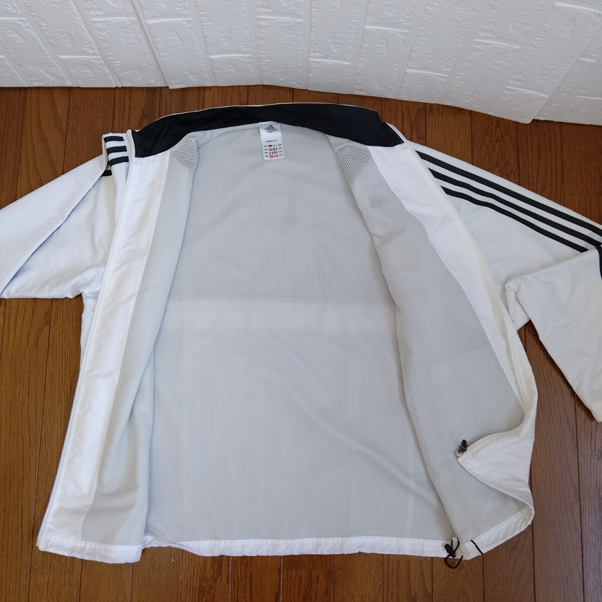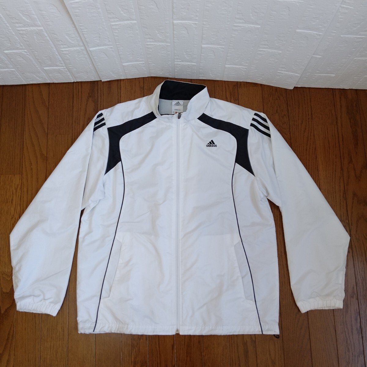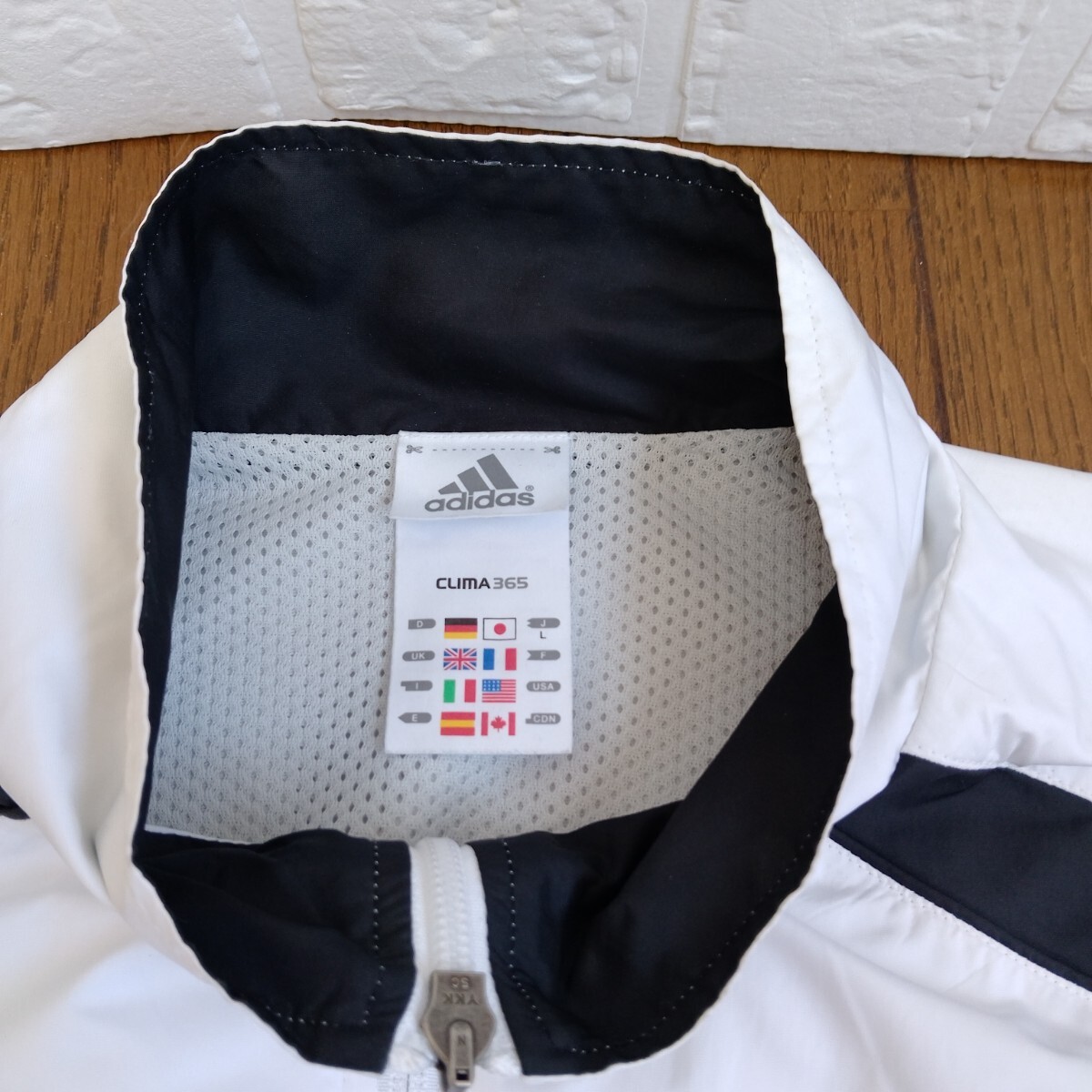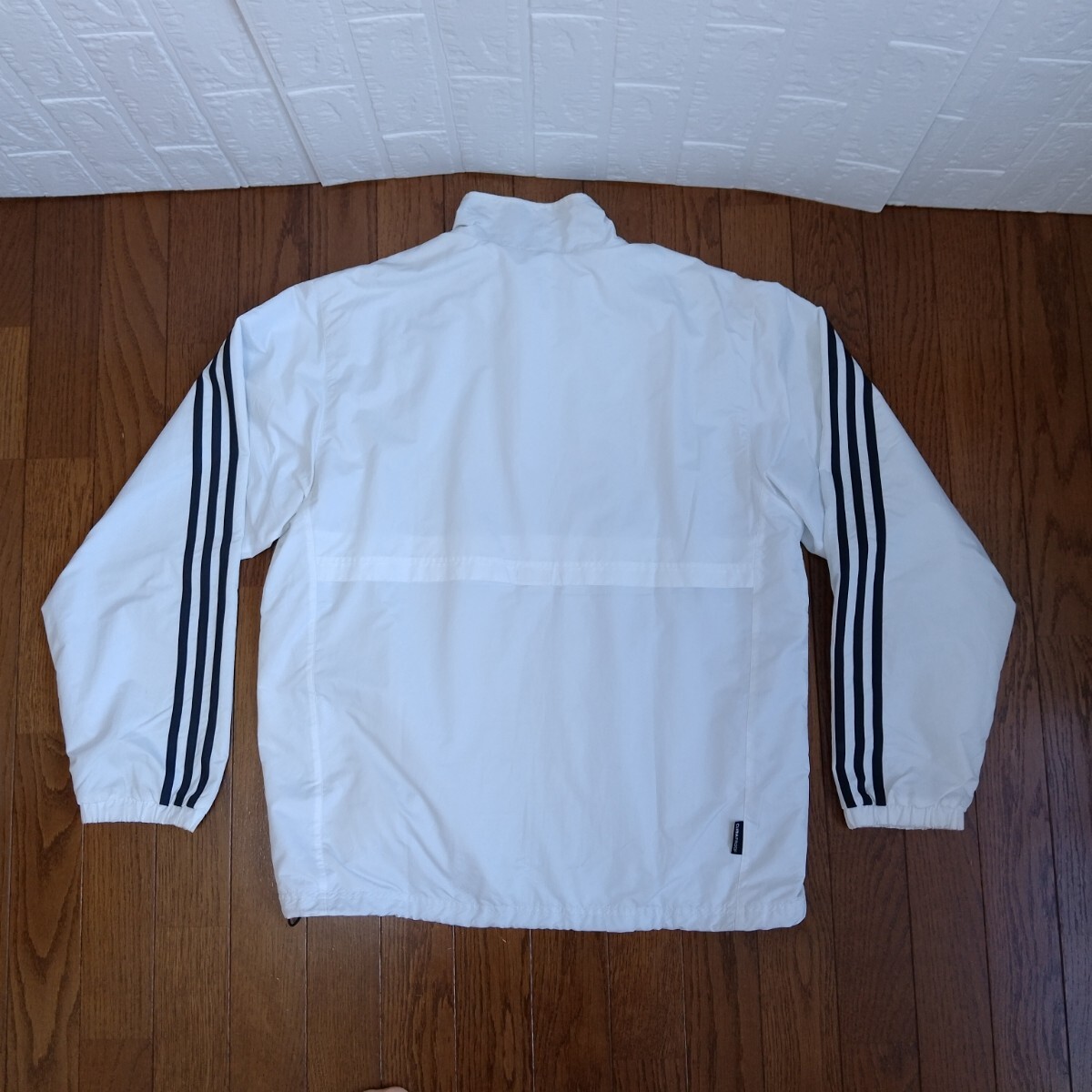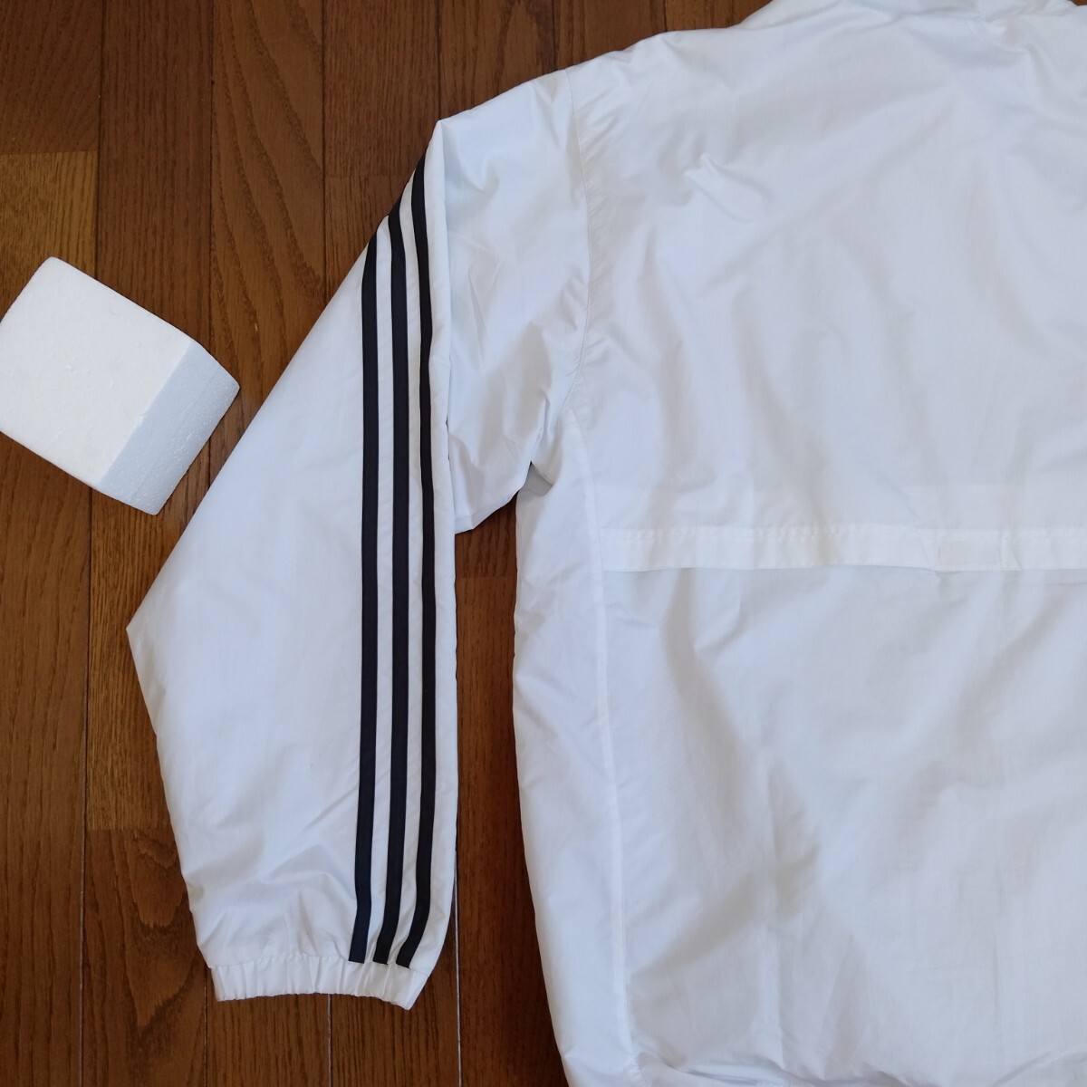 ※adidasのホワイトスポーツジャケット、黒のアクセントと3本のストライプが特徴。