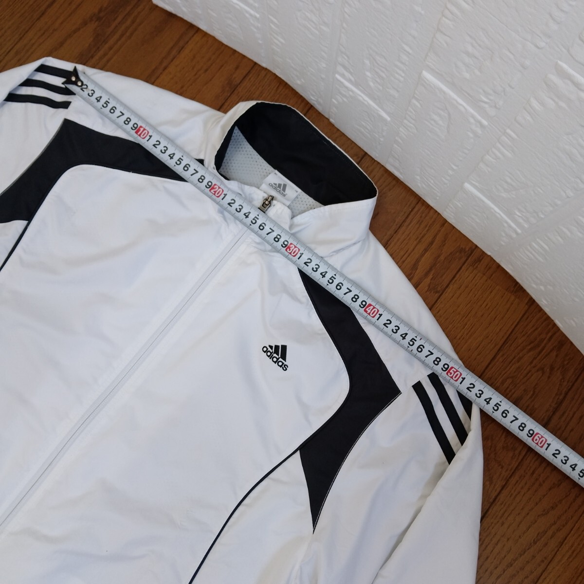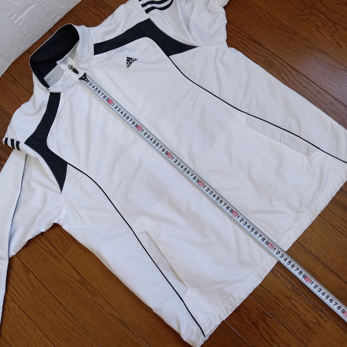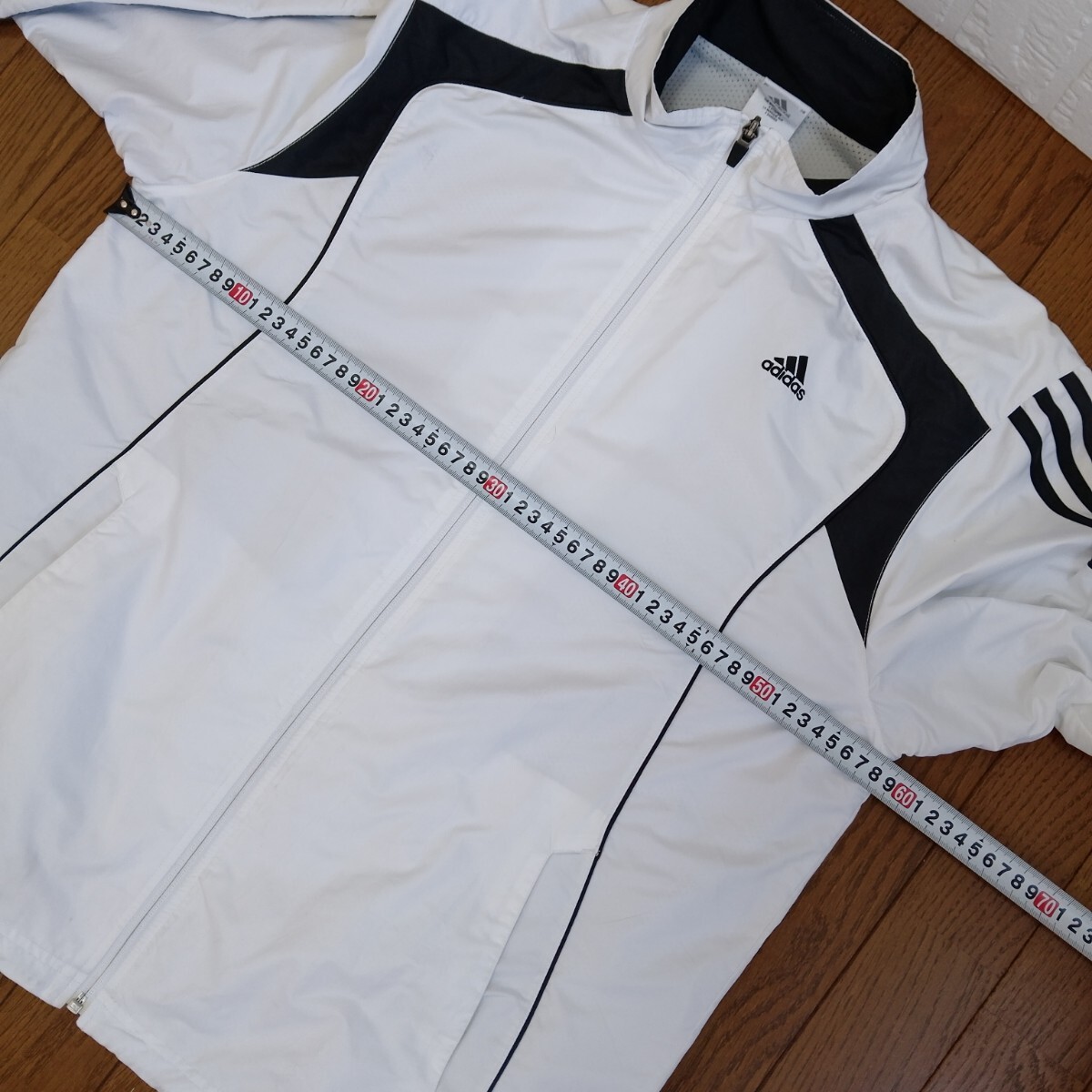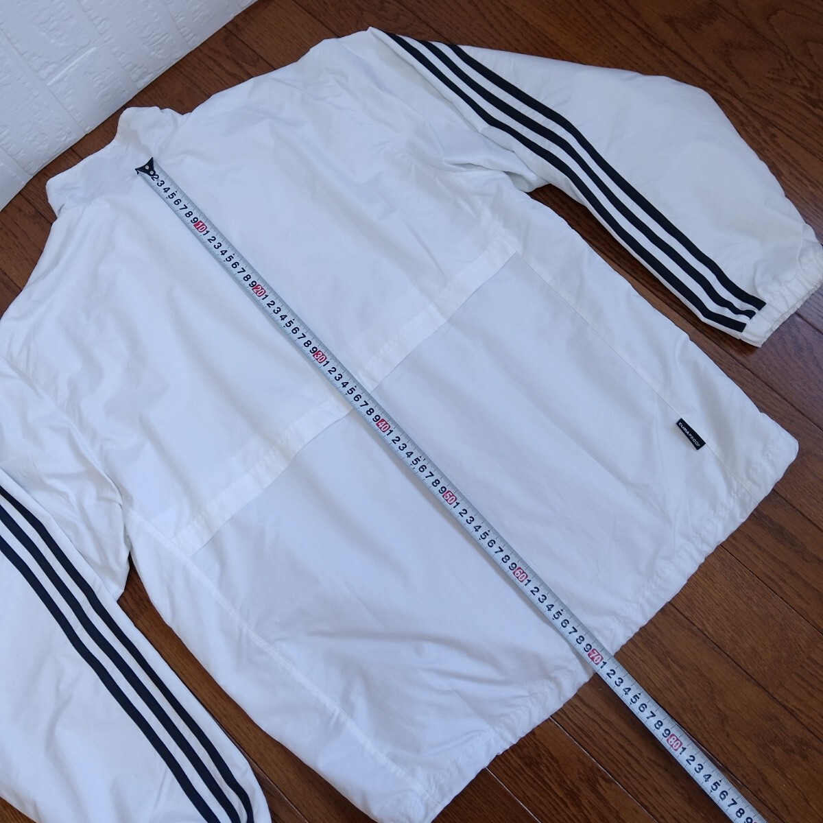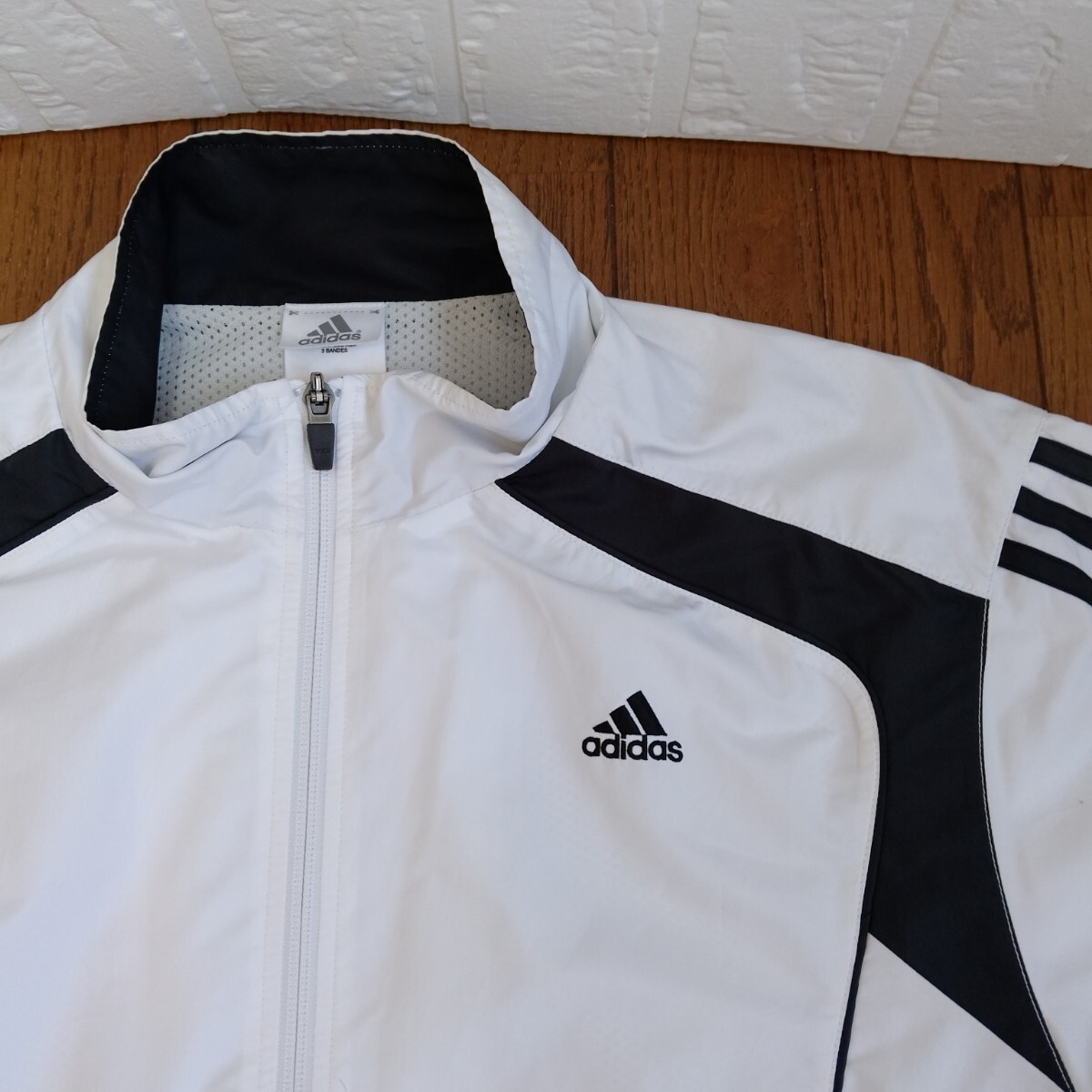 ※adidasのホワイトスポーツジャケット、黒のアクセントと3本のストライプが特徴。