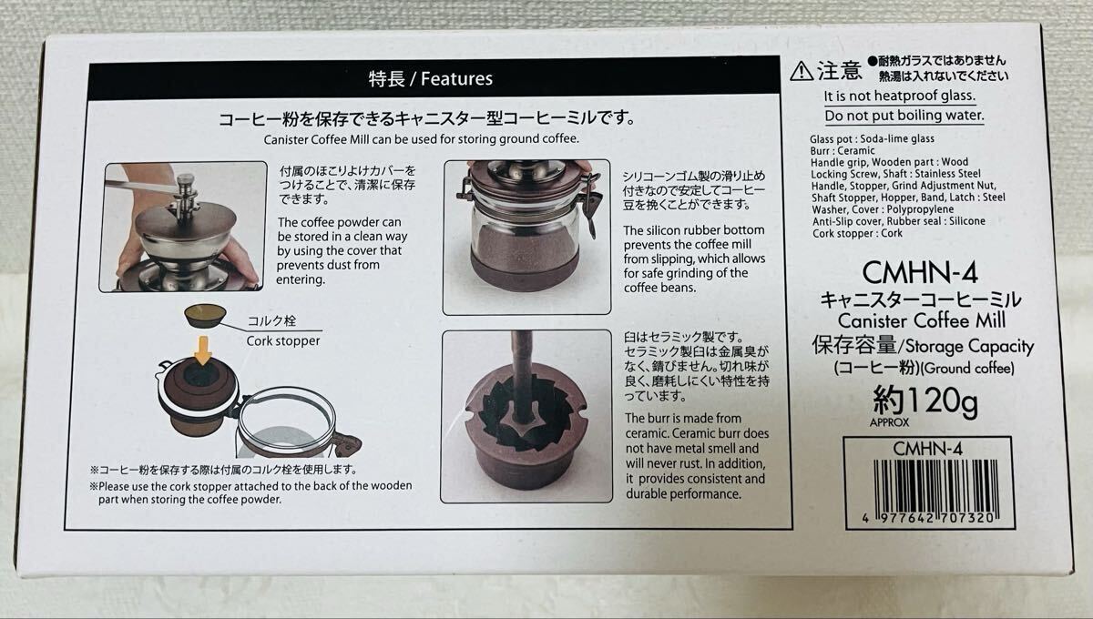 ハリオ キャニスターコーヒーミル 手動式 珈琲 HARIO Canister Coffee Mill CMHN-4 コーヒーの保存容量120gの容器です