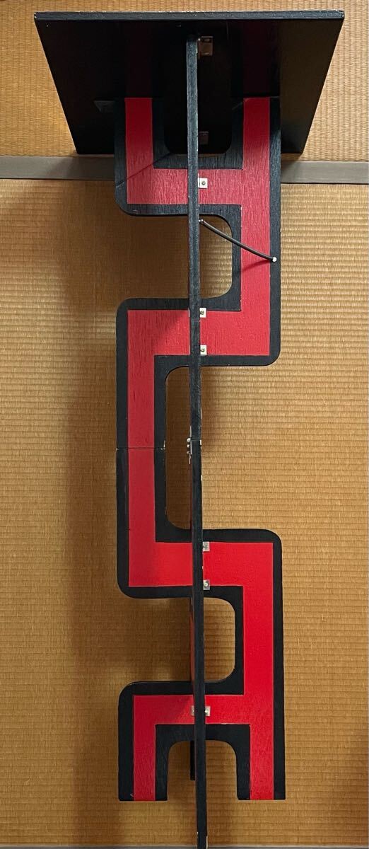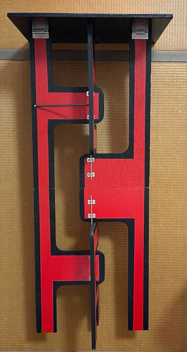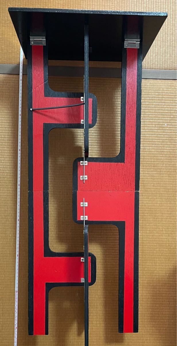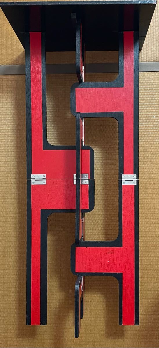 自作品のパタパタテーブルです。天板を持って引き上げればバネで足は簡単に開きます。畳むときは開いた足をとじて天板側に折りたたむだけです。
