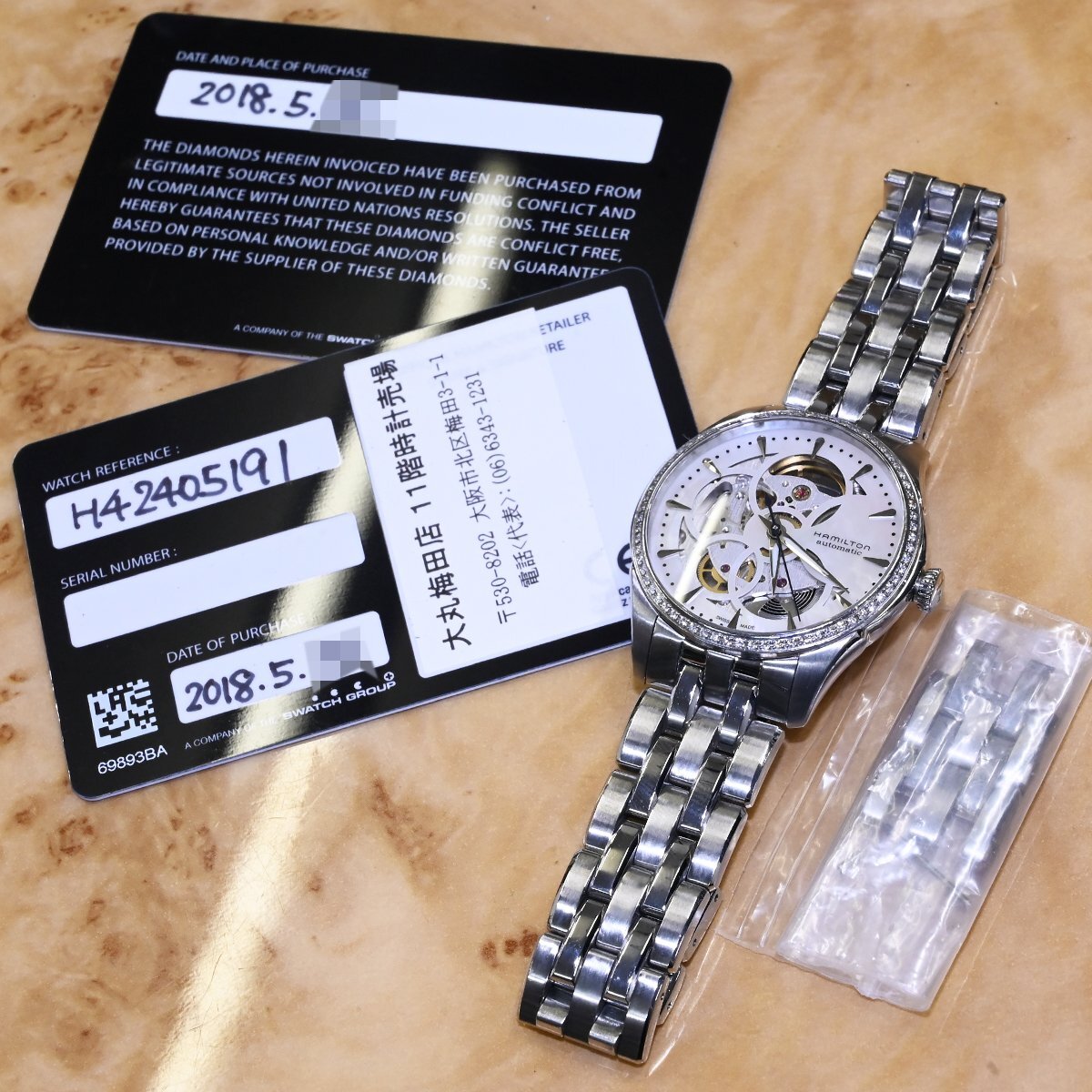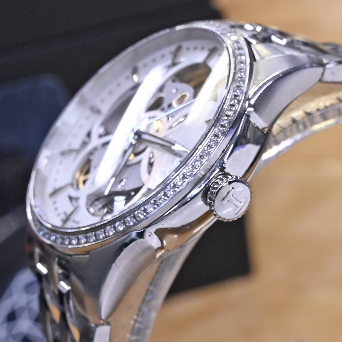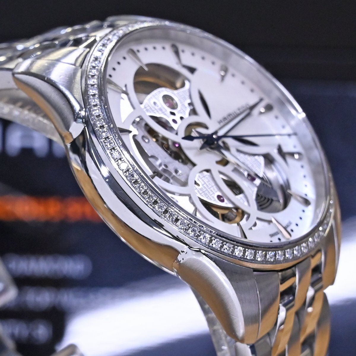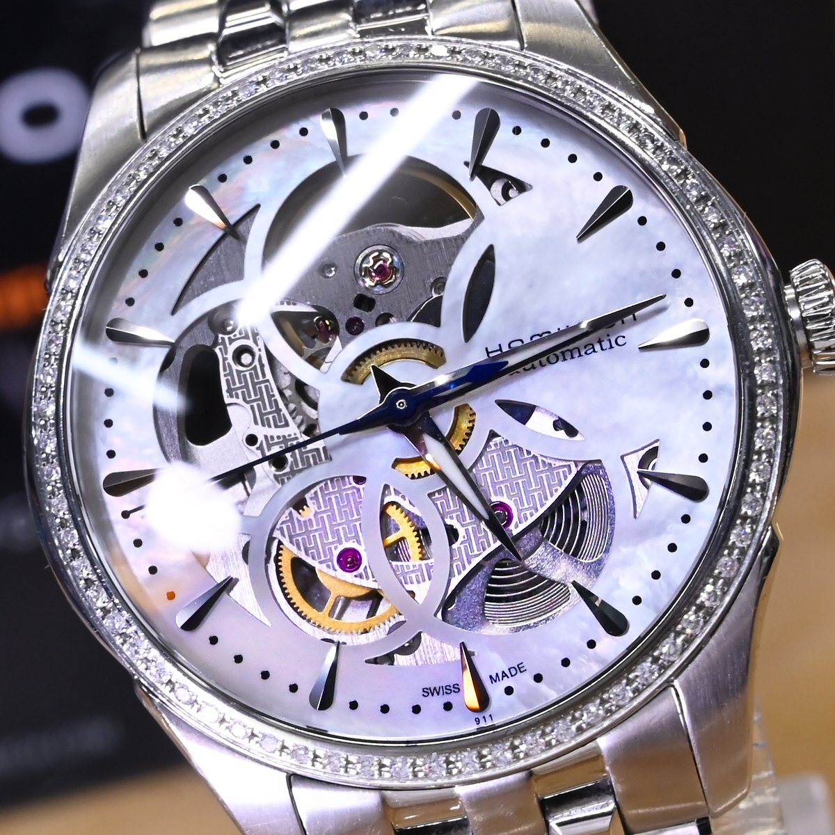 ハミルトンのダイヤモンド スケルトン ジャズマスター ビューマチックです。 一瞬で心を奪う透明美学── ホワイトマザーオブパールのスケルトンダイヤルから、旋律のごとく躍動するムーブメントの息遣いが見える。 ベゼルには68個のダイヤモンドが華やかに配され、時計というより、手首の上に広がる「生きたアート」となっています。 ケースは堅牢なステンレス製ながら、サファイアクリスタルの裏蓋を通してキャリバーH20S(自動巻・約40~42時間パワーリザーブ)の心臓部が覗くVIEWMATIC仕様。 煌めきをまといながら澄んだ時間を刻む、この唯一無二の造形は、まさに「動く宝石」。 市場流通量の圧倒的に少ないモデルなのでお探しの方も非常に多いかと思います。 ※基本動作確認済。 |
