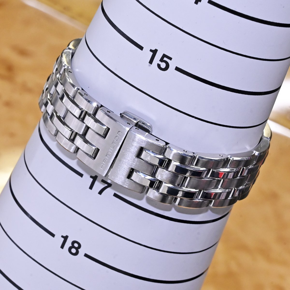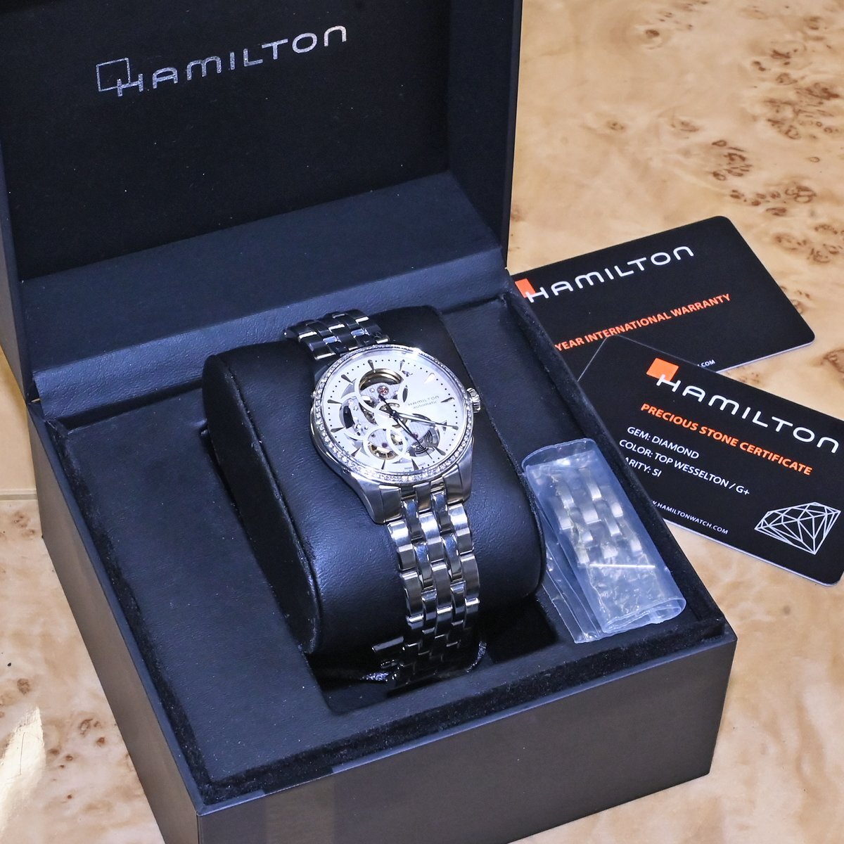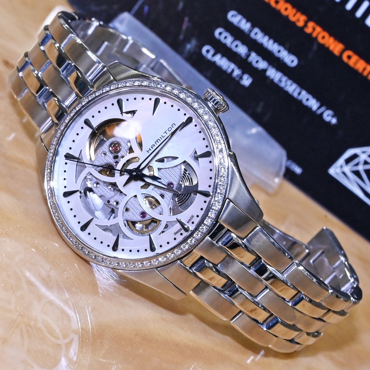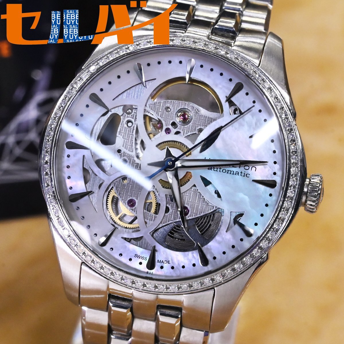 ハミルトンのダイヤモンド スケルトン ジャズマスター ビューマチックです。 一瞬で心を奪う透明美学── ホワイトマザーオブパールのスケルトンダイヤルから、旋律のごとく躍動するムーブメントの息遣いが見える。 ベゼルには68個のダイヤモンドが華やかに配され、時計というより、手首の上に広がる「生きたアート」となっています。 ケースは堅牢なステンレス製ながら、サファイアクリスタルの裏蓋を通してキャリバーH20S(自動巻・約40~42時間パワーリザーブ)の心臓部が覗くVIEWMATIC仕様。 煌めきをまといながら澄んだ時間を刻む、この唯一無二の造形は、まさに「動く宝石」。 市場流通量の圧倒的に少ないモデルなのでお探しの方も非常に多いかと思います。 ※基本動作確認済。 |