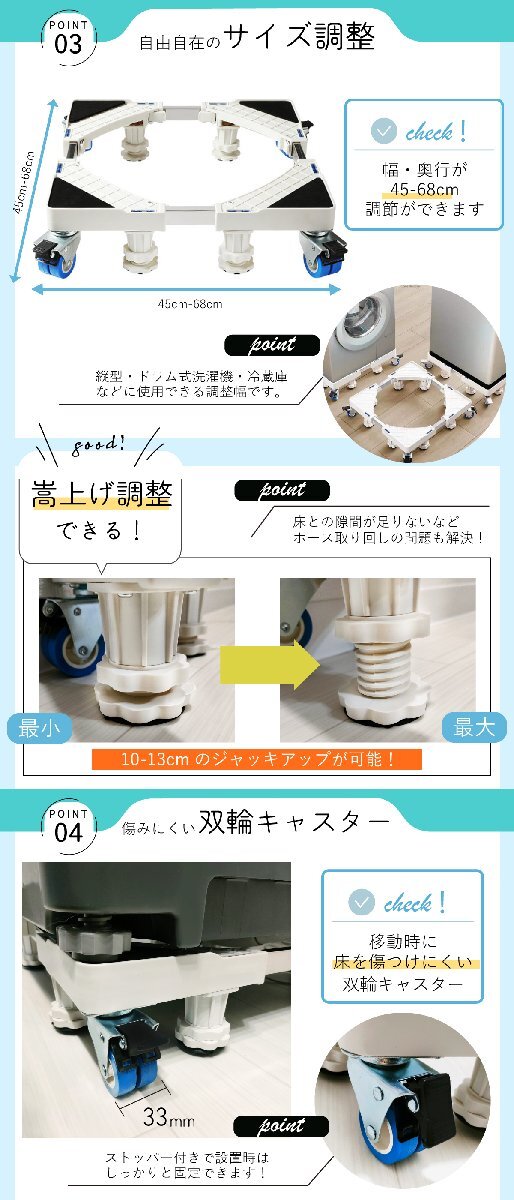 【サイズ調整可能】幅・奥行きが45‐68cm、高さは10-13cmの調整が可能です。ドラム式洗濯機や縦型洗濯機、冷蔵庫、食器棚、什器など、さまざまな用途でご使用いただけます。