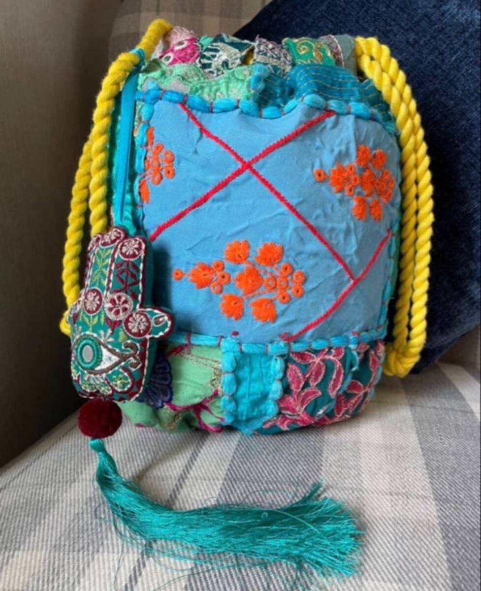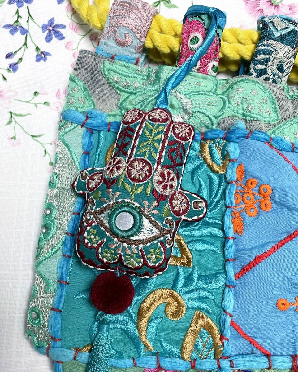 マライカで購入したカンバディア刺繍巾着バッグとハムサ刺繍キーホルダーです