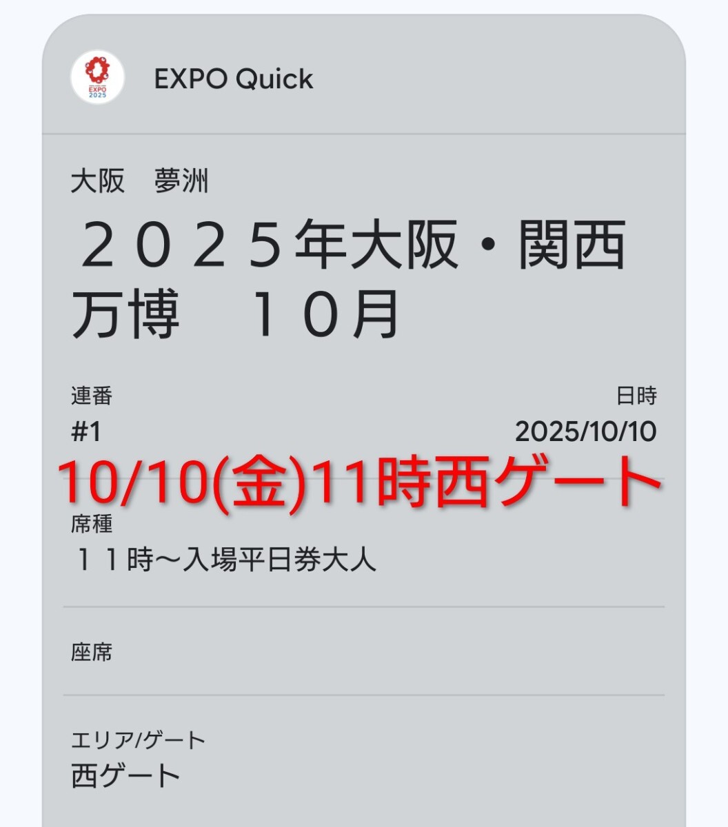 10/10(金)11時、西ゲートの予約です。大人1枚。