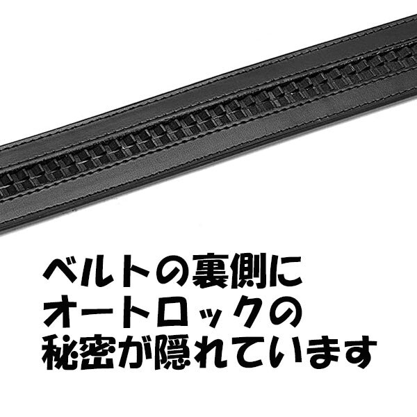 穴なし オートロック式のメンズ ベルトです カジュアル ビジネス ゴルフなど 様々なシーンで使えるブラックレザーのベルト バックルにベルトを通すだけで カチカチと締まっていきます 外す時はバックルのボタンを押すだけで 簡単にロック解除されます バックル 幅4cm×長さ8.7cm ベルト 幅3.3cm×長さ118cm 送料を安く抑えるため折り曲げて発送しています |