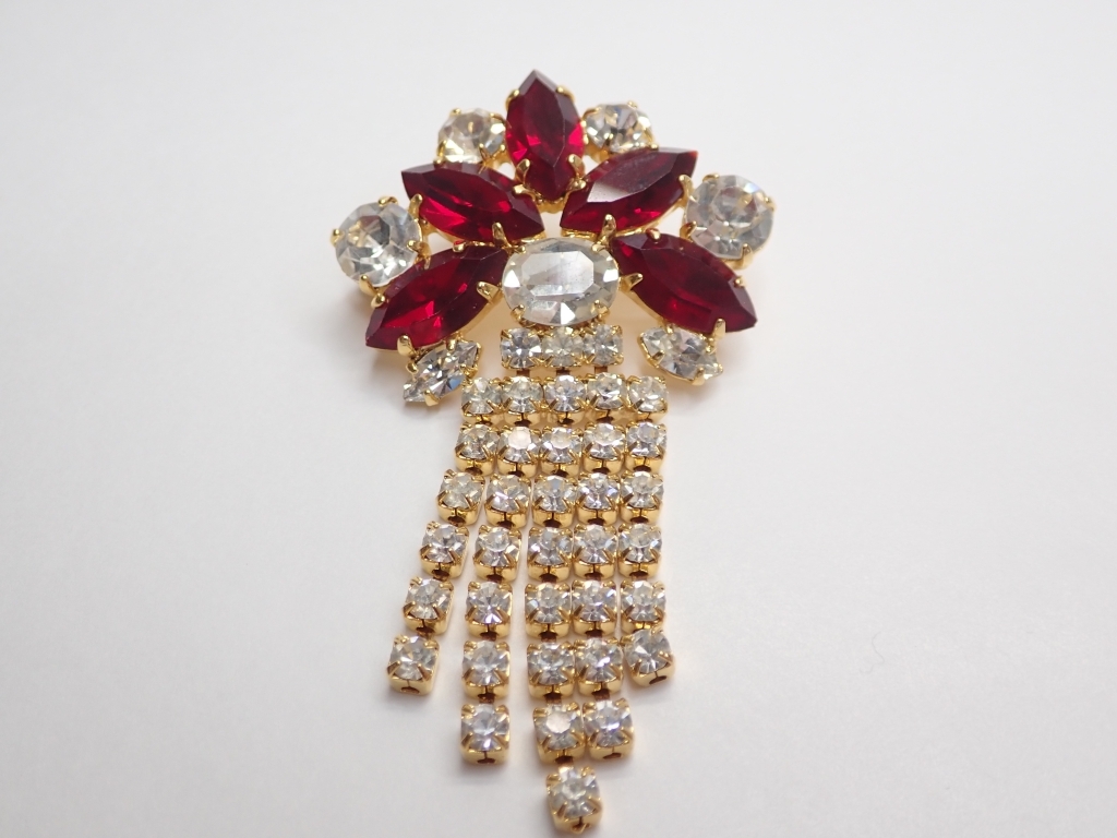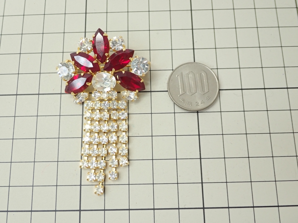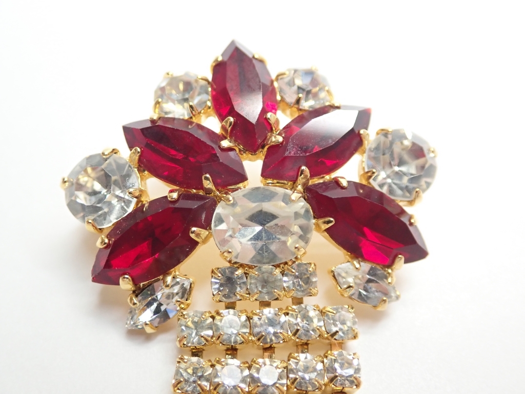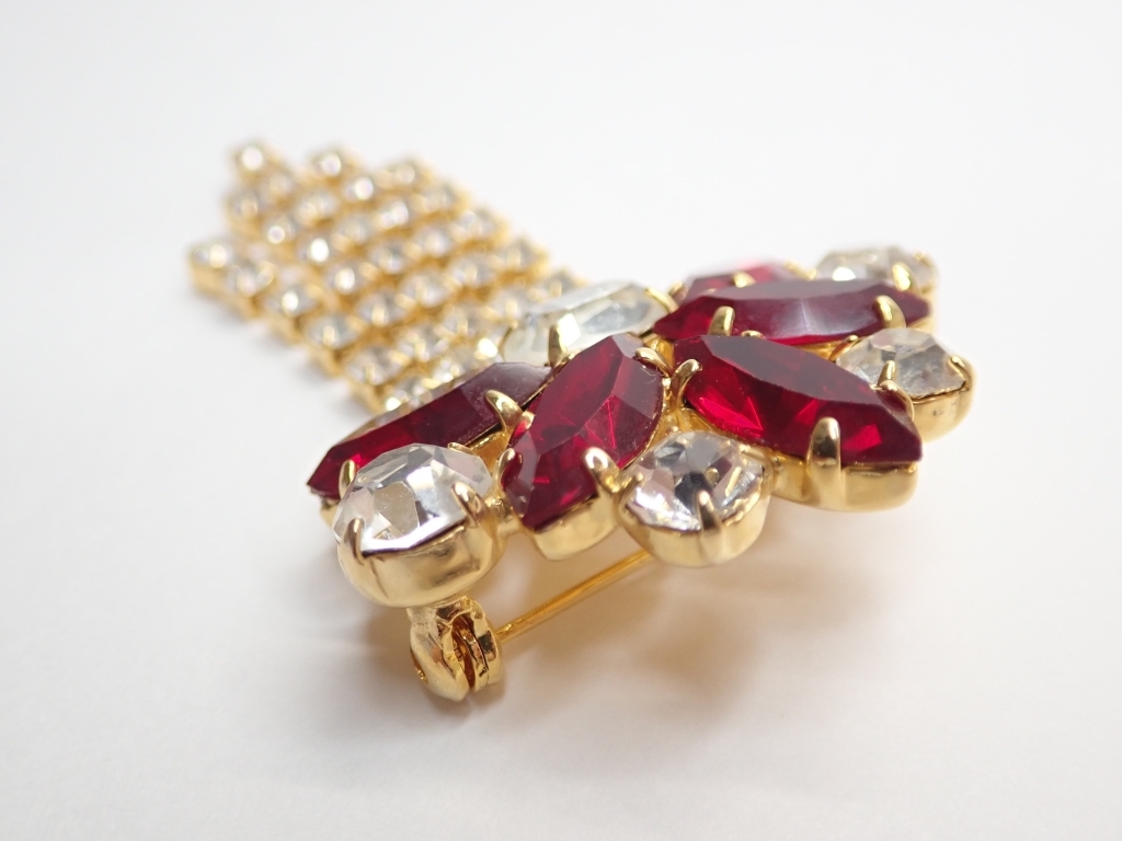 L102 ヴィンテージ ブローチ ゴールドカラー ラインストーン クリア×レッド Vintage brooch