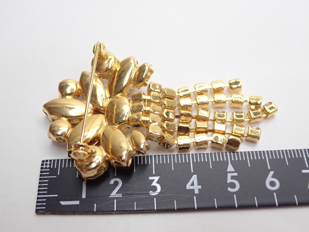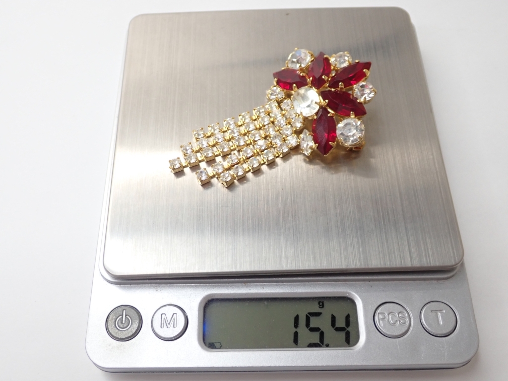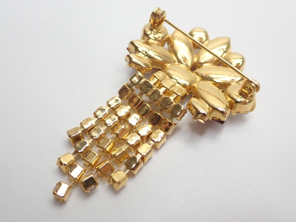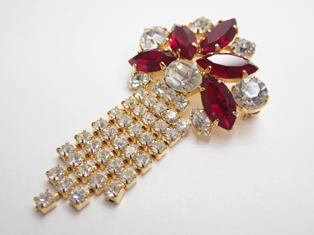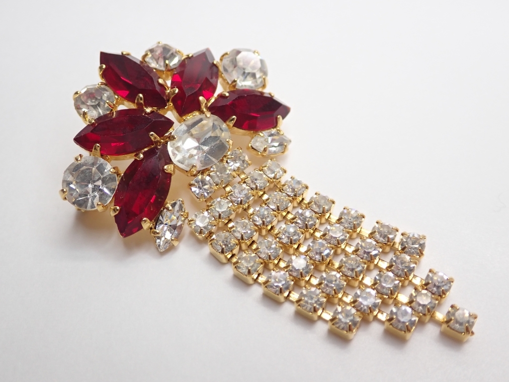 L102 ヴィンテージ ブローチ ゴールドカラー ラインストーン クリア×レッド Vintage brooch