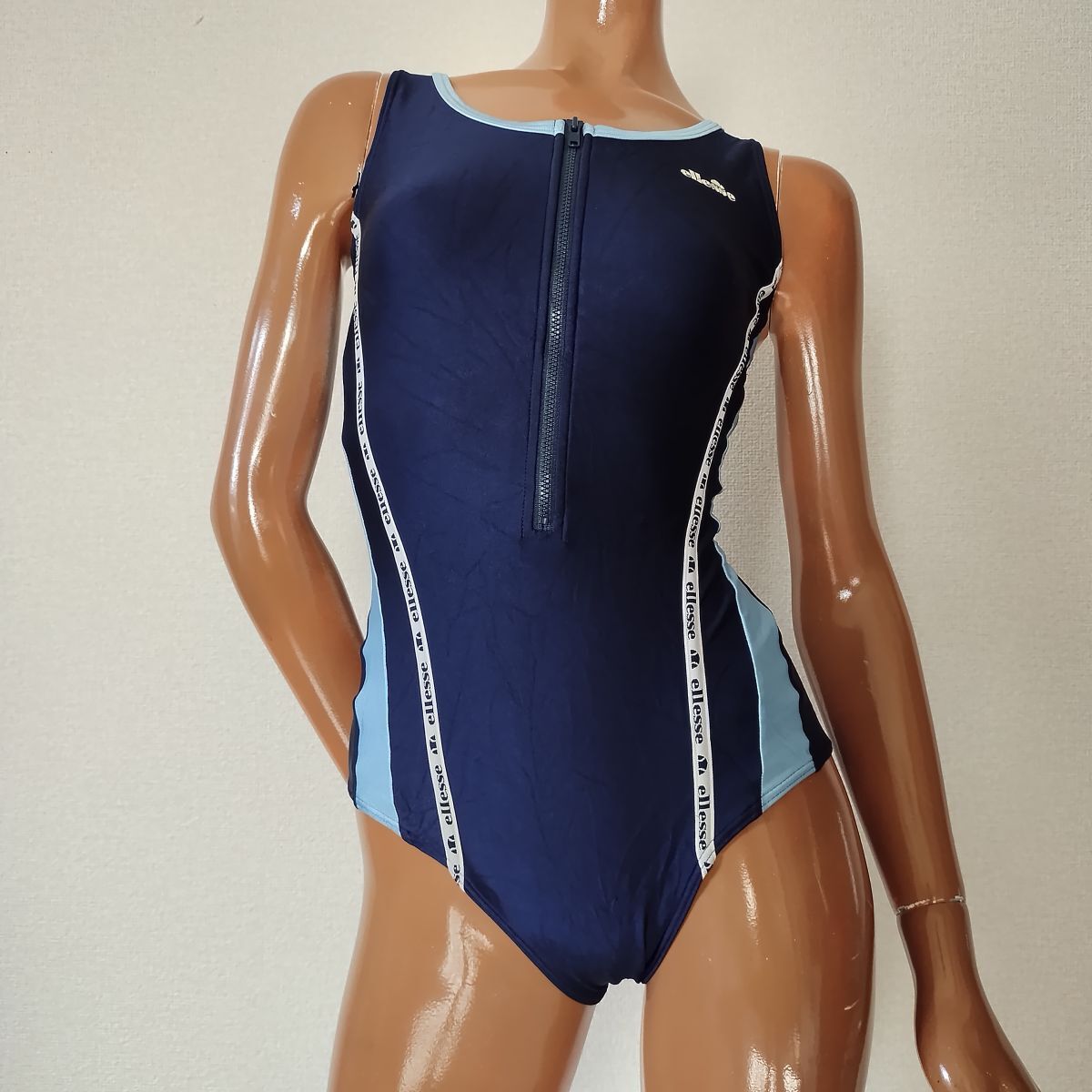 31*エレッセellesse女子競泳水着(Oサイズ)★ESP-148Y★光沢濃紺ネイビー水色ブルーサイドパイピングフロントジップ★大きいサイズ男性も