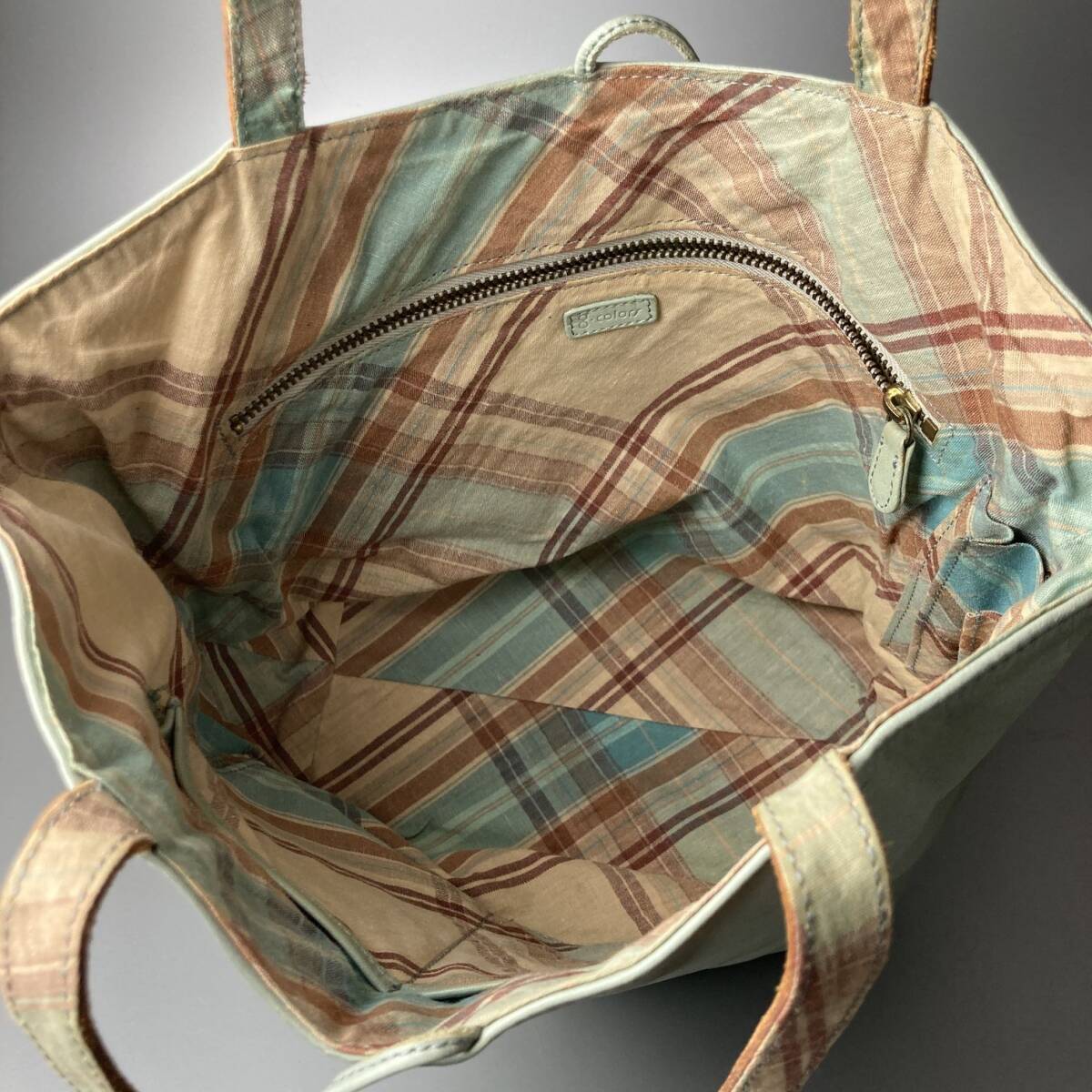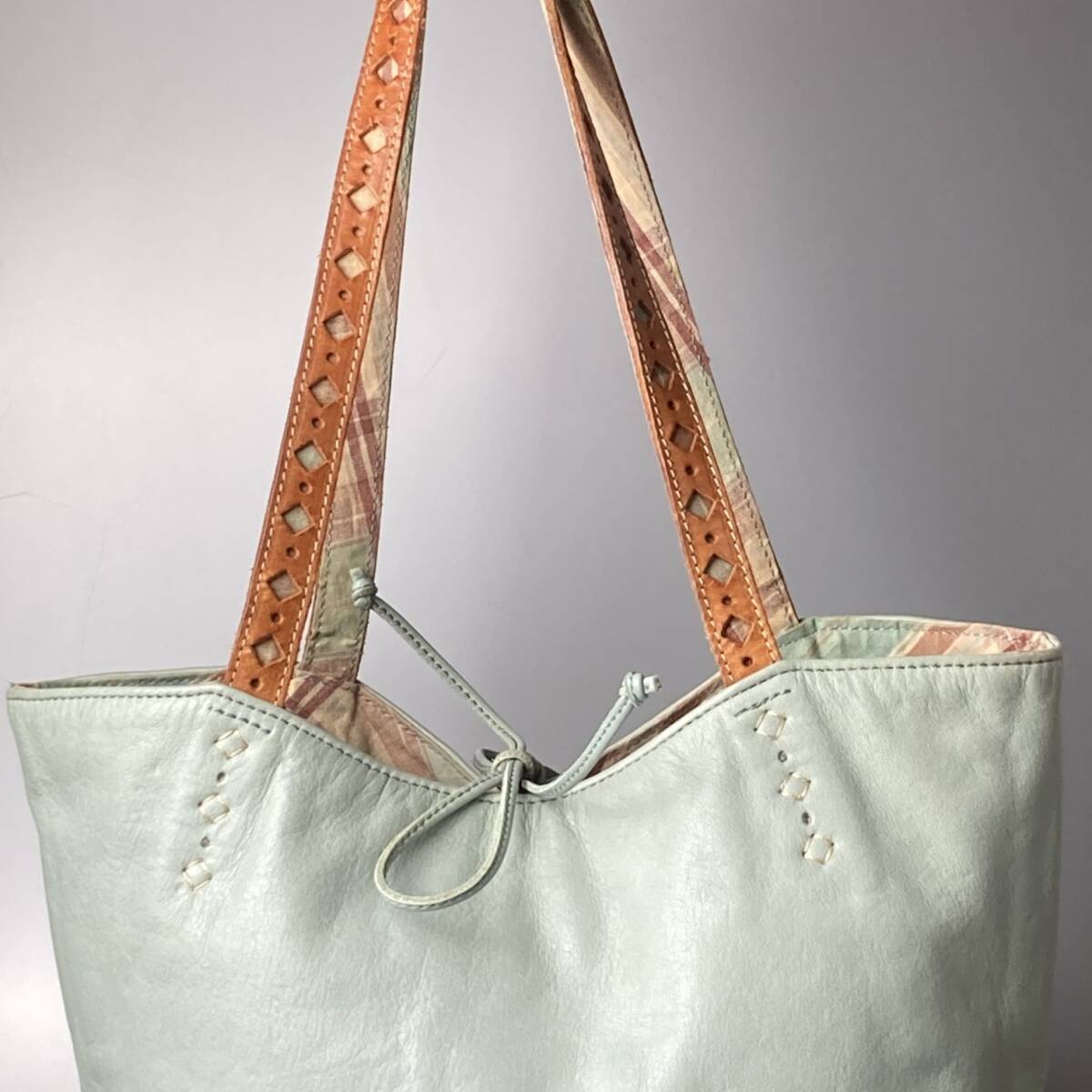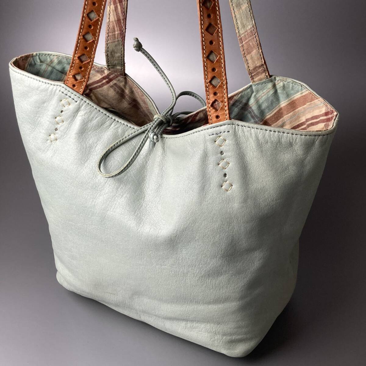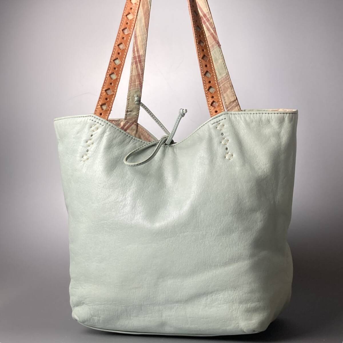 ハンドルには切り抜きデザインのレザーベルトを組み合わせ、内側にはトラッドなチェック柄のライニングを採用。
