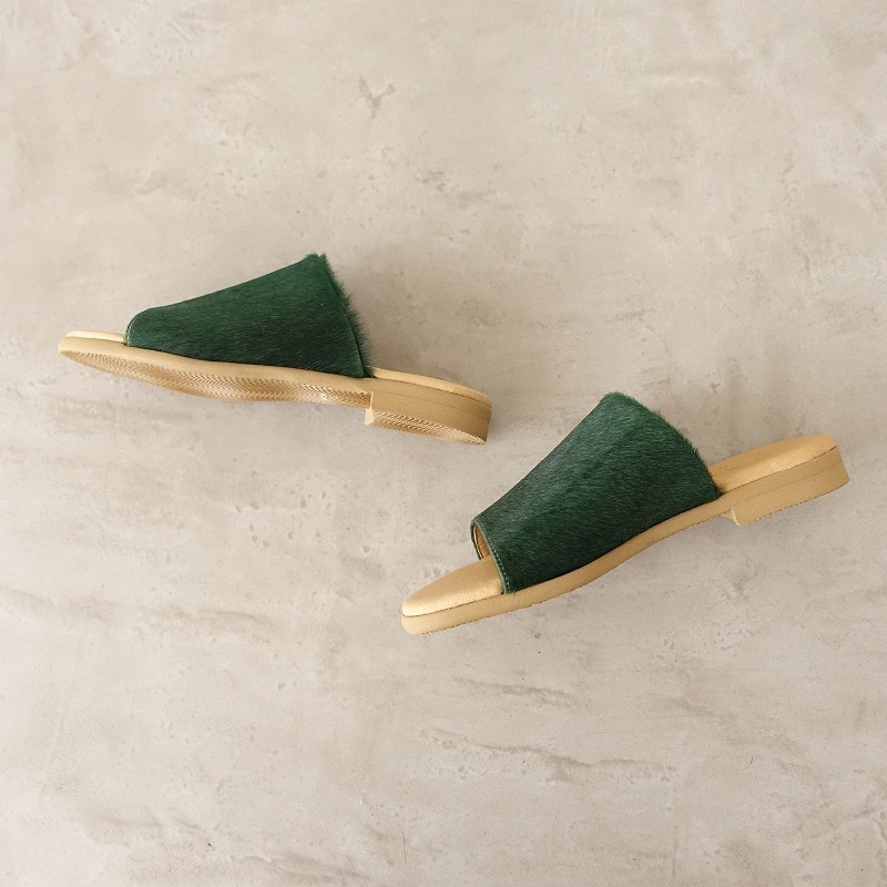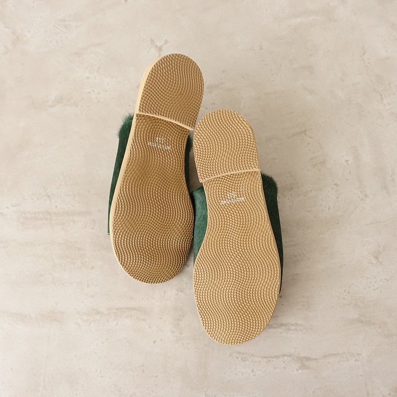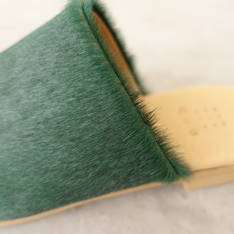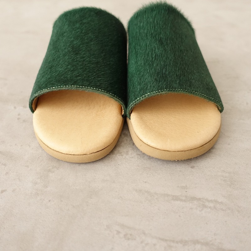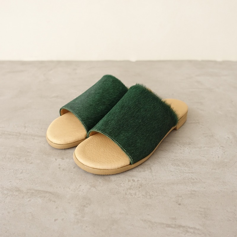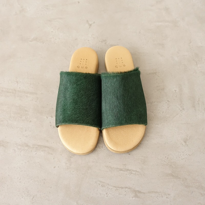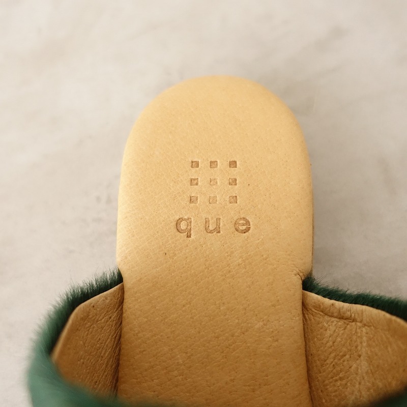 queのオープントゥサンダルです。カラーは少しムラ感のあるダークグリーンで、ハラコレザー素材です。インソールはライトブラウンで、クッション性がございます。オープントゥタイプで、シンプルなデザインです。 |