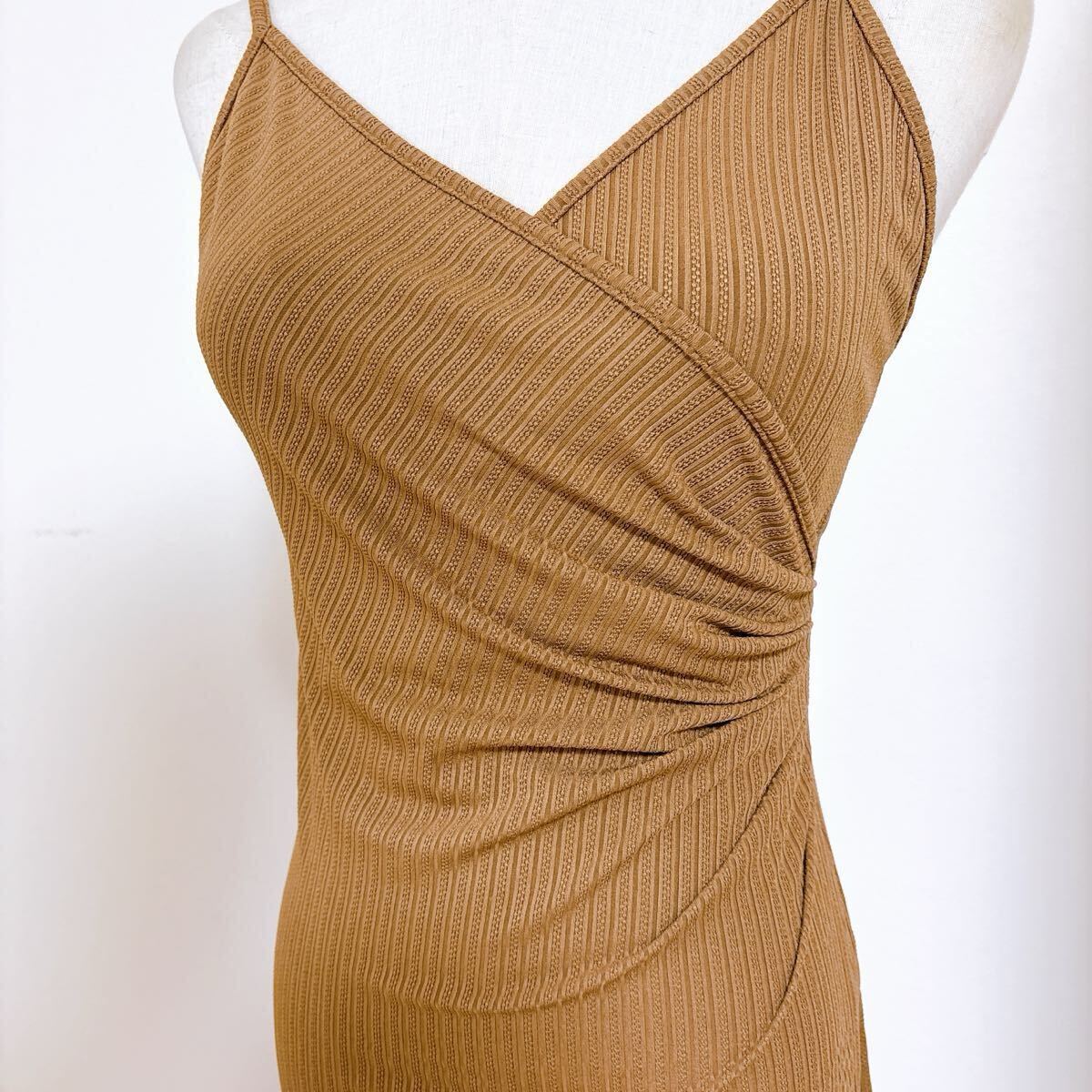 トレンドのリブニット素材を使用したキャミソールワンピースです。カシュクールデザインが女性らしいシルエットを演出し、サイドスリット入りで動きやすさも確保。マスタードイエローの温かみのある色合いが、春夏から初秋まで幅広いシーズンで活躍します。