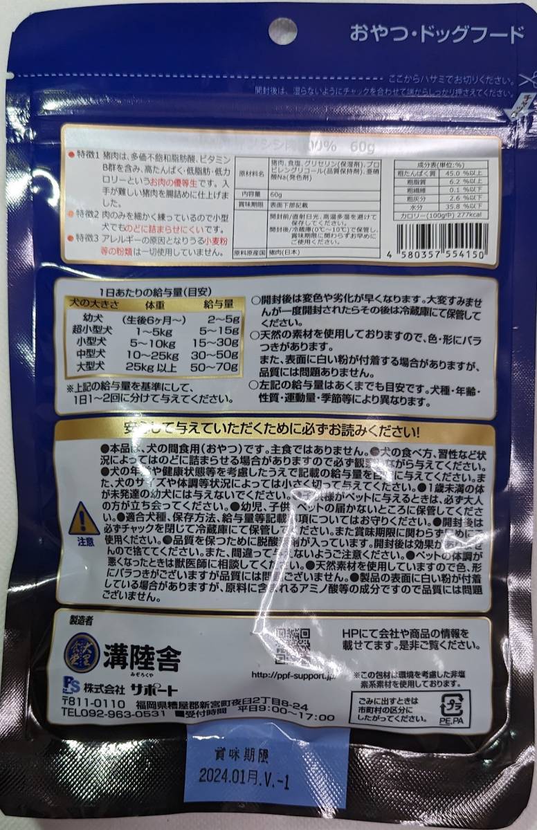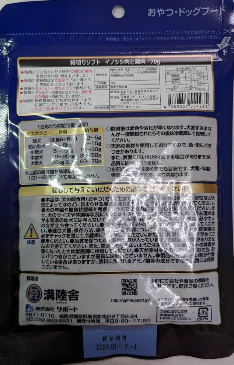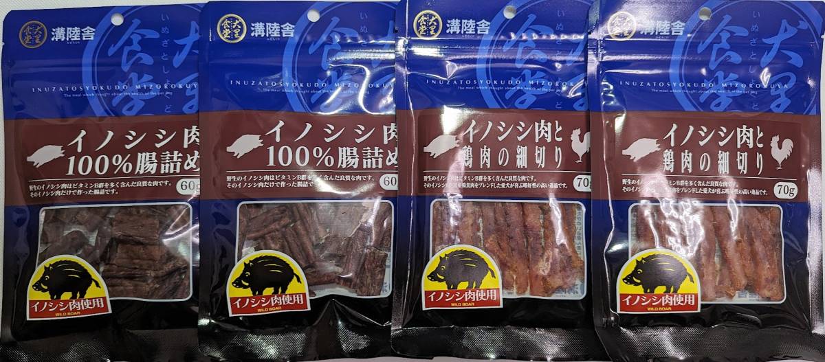 ・品名 猪肉の腸詰め 120g(60g×2)+イノシシ肉と鶏肉の細切り 140g(70g×2)