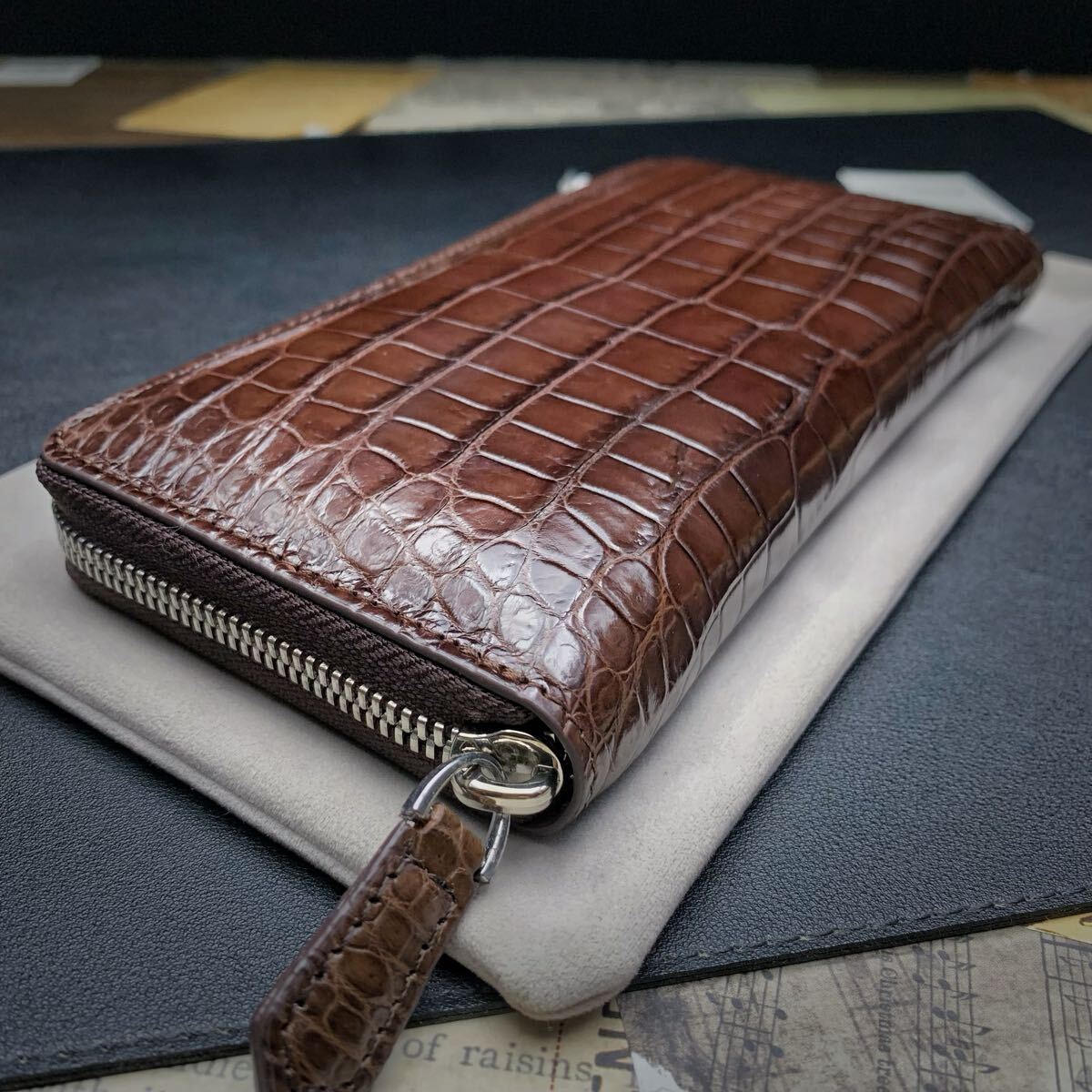 【実物撮影】新品 クロコダイル メンズ 長財布 ラウンドファスナー 未使用 ワニ 鰐 腹革 希少茶色 ウォレット