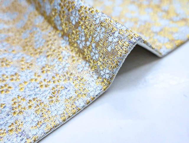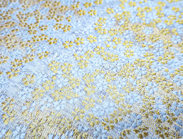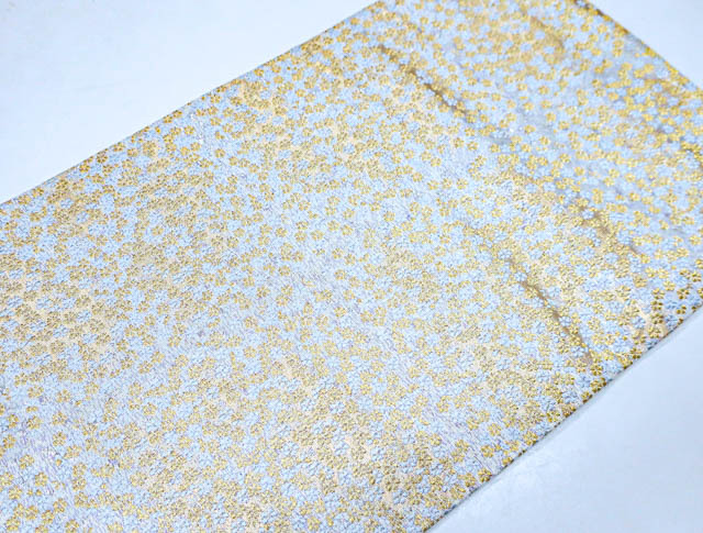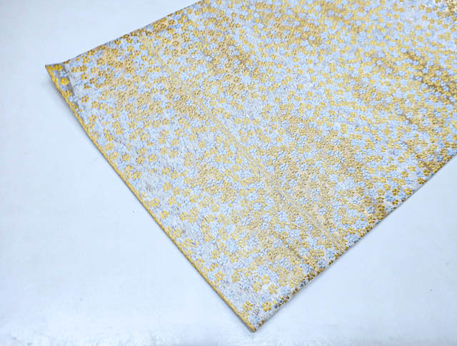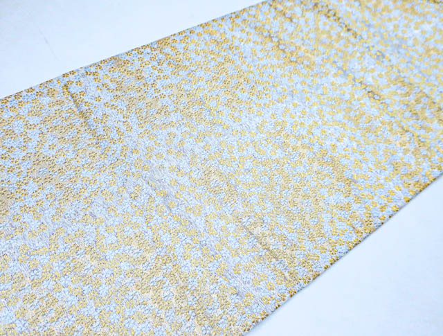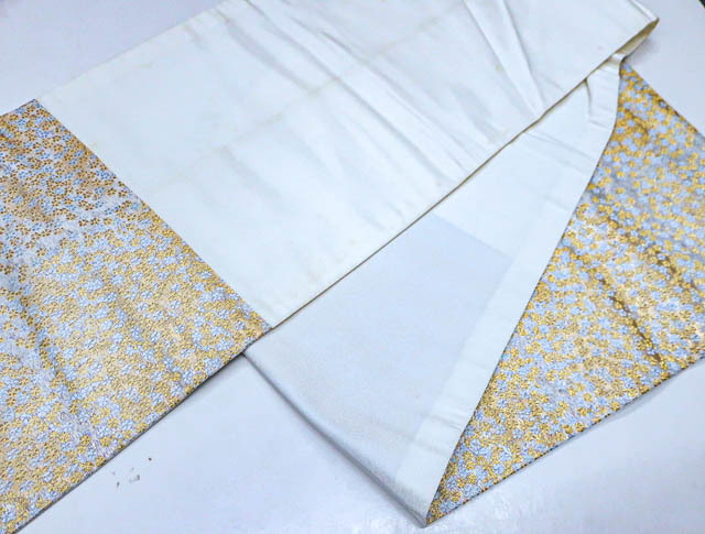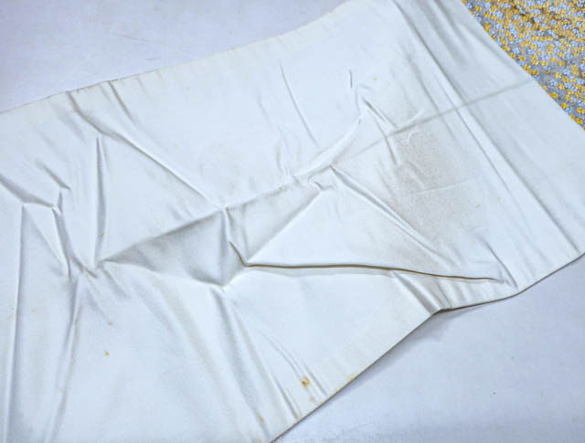 リサイクル商品のため、無地場、裏地にシミ、無地場にシワがございますが、着用可能なお品です。 地色は、シルバーです。 1枚目の画像が近いお色かと思われます。 素材は正絹です。 |
