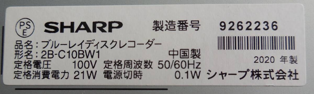 【作動品】SHARP シャープブルーレイレコーダー 2B-C10BW1 内蔵ハードディスク(1TB) 2番組同時録画 2020年製 新品リモコン付き ①