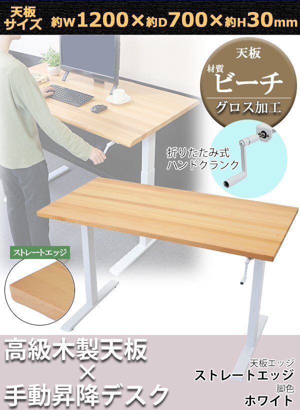 商品名 | 送料無料 昇降デスク 手動 W1200×D700×H735〜1185mm ビーチ材 高級 木製 天板 グロス加工 耐荷重約70kg(脚部) スタンディングデスク 上下昇降 デスク 手動昇降 上下昇降 昇降デスク 高さ 調整 オフィスデスク 昇降式デスク 昇降テーブル 昇降式テーブル ストレートエッジ 脚色 ホワイト hk01120beechg |