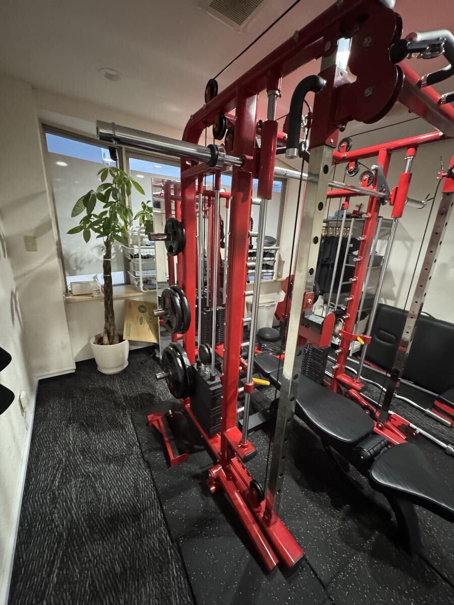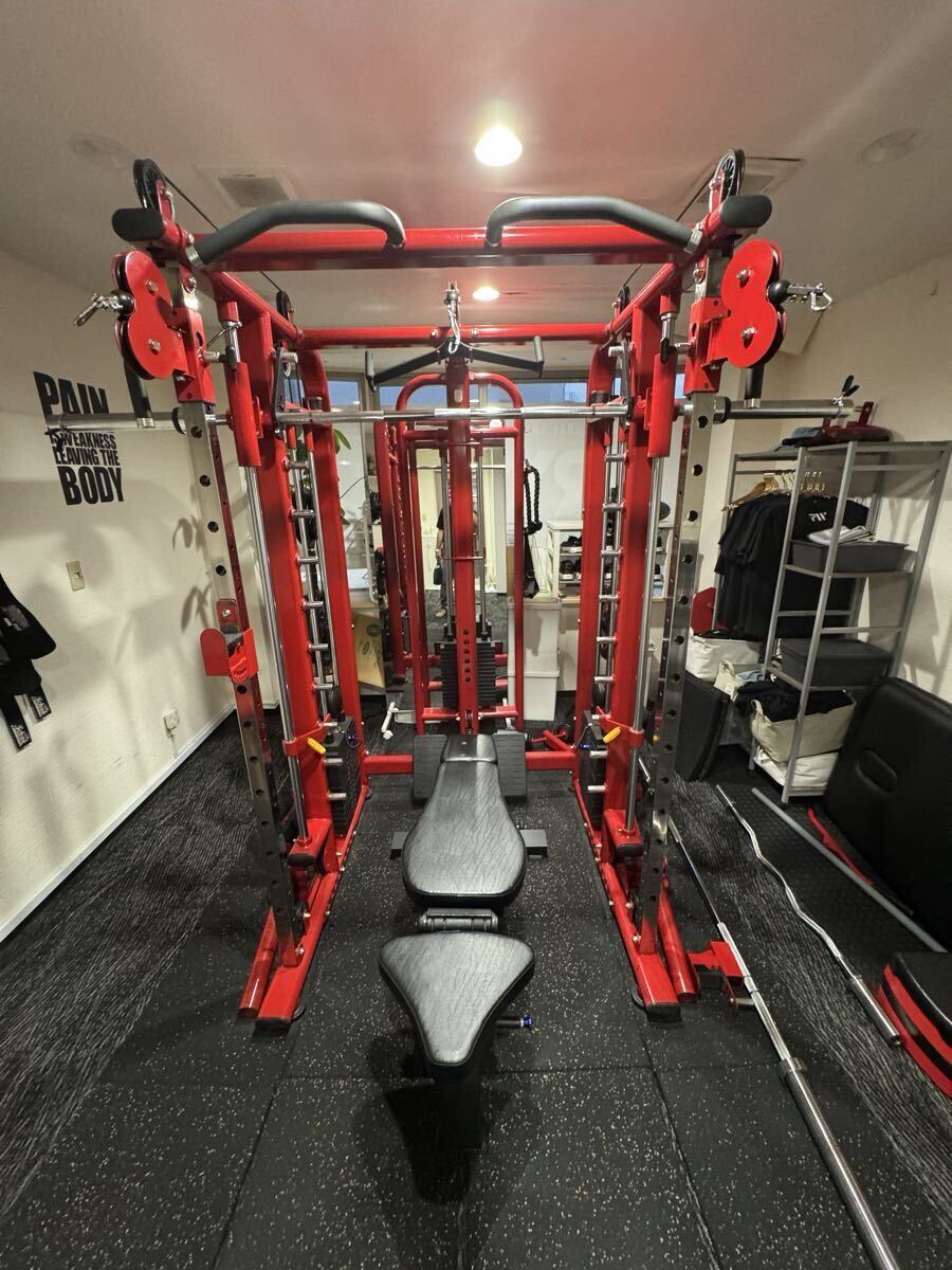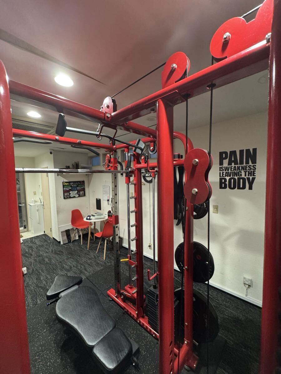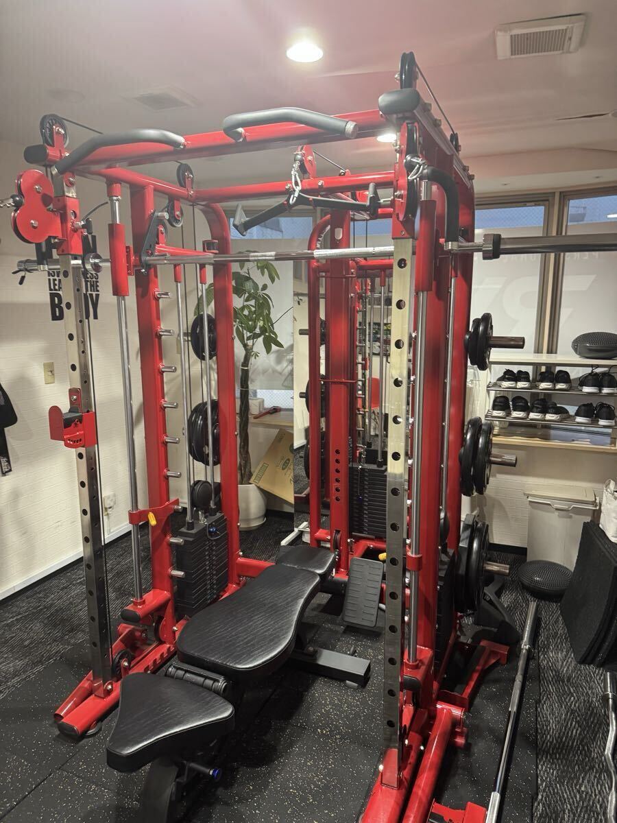 パワーラック、スミスマシン、ケーブルクロス、ラットプル、ローイング、ディップスなど多彩なトレーニングが可能です。