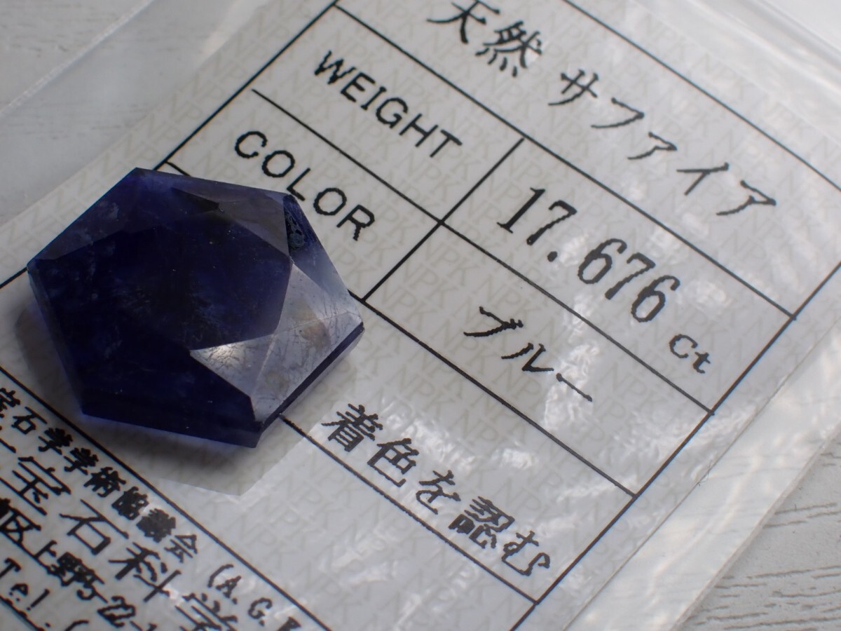 六角形天然サファイア17.676ct 日本宝石科学協会ソーティング付き