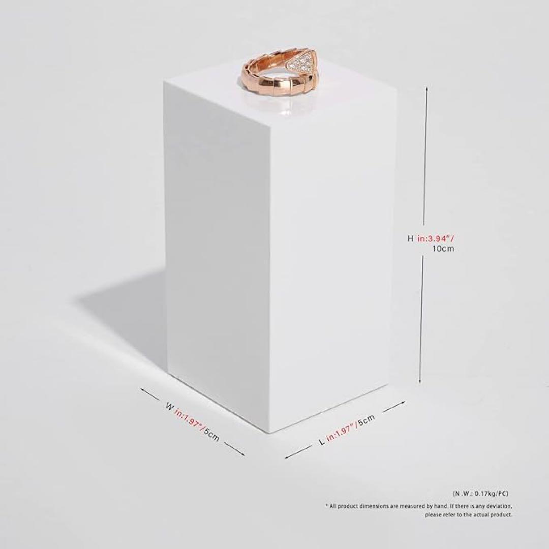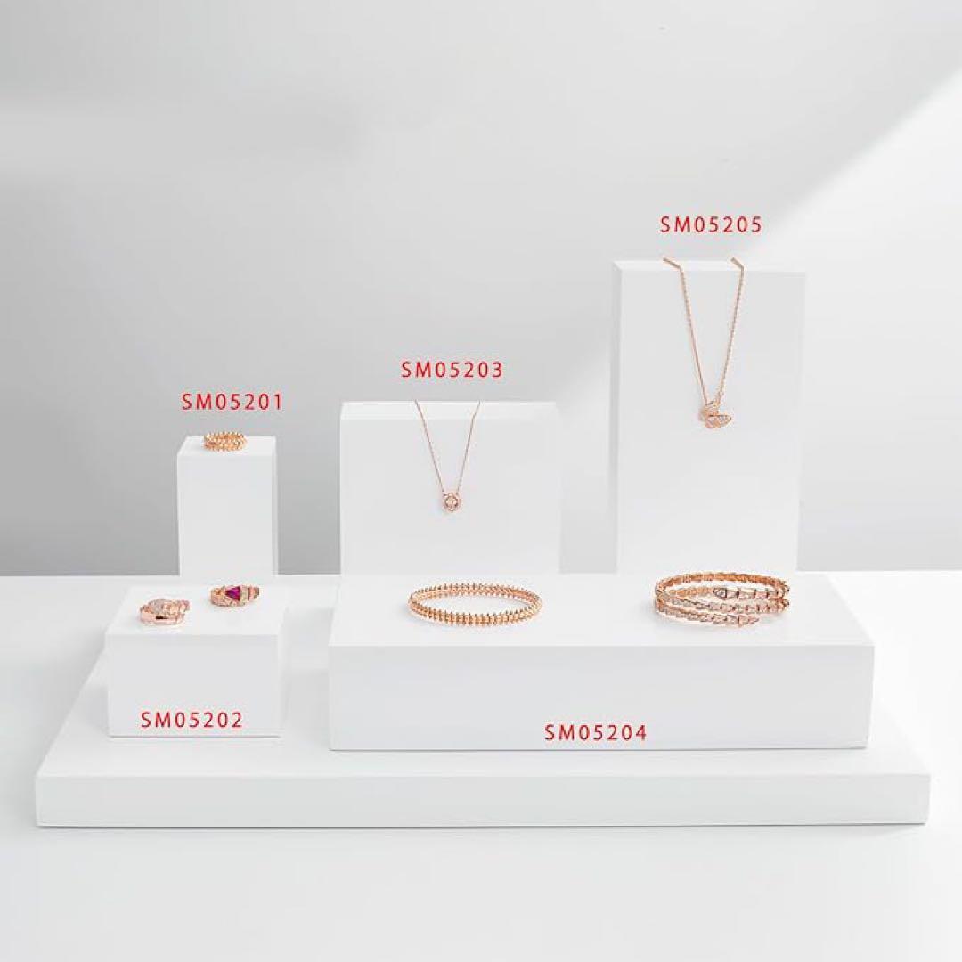 美しくシンプルな白い正方形のジュエリー ディスプレイスタンドが、ジュエリーの高級感を溢れます。
