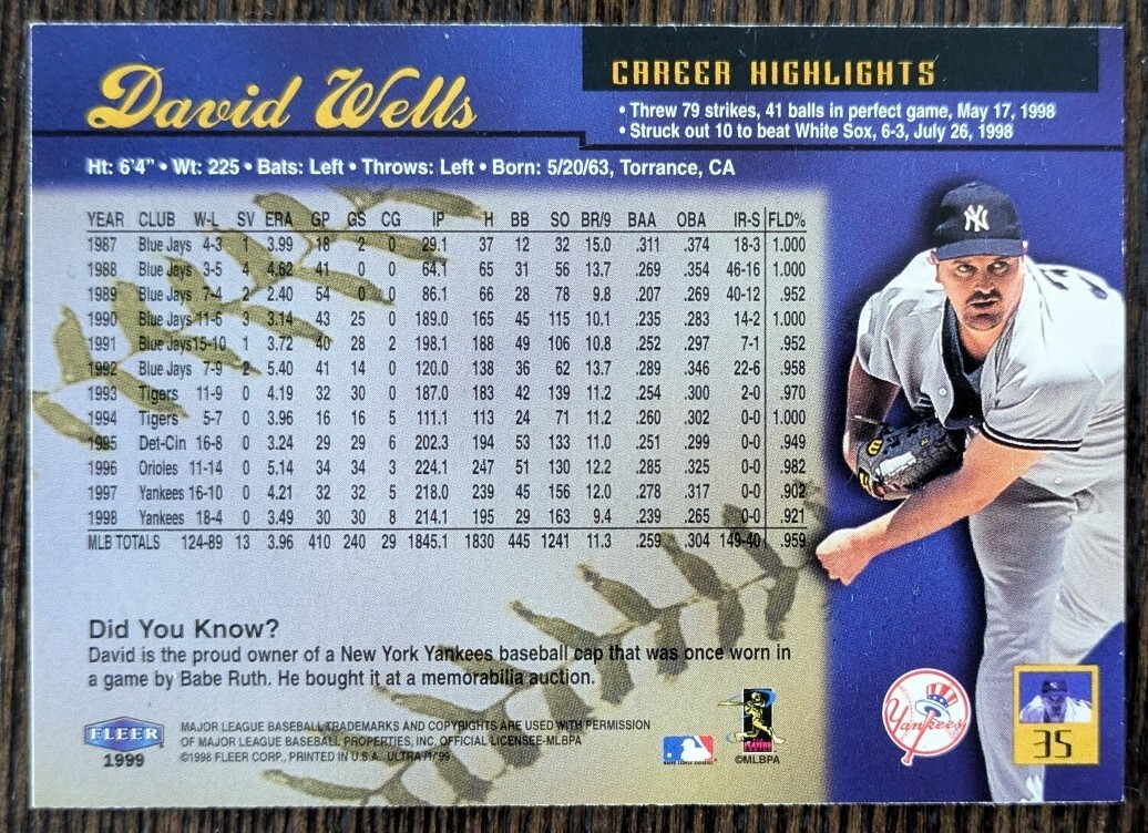 【1999 FLEER ULTRA】ニューヨーク・ヤンキース デビッド・ウェルズ(David Wells)完全試合シーン【with 伊良部秀輝】