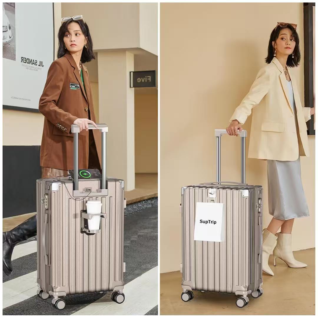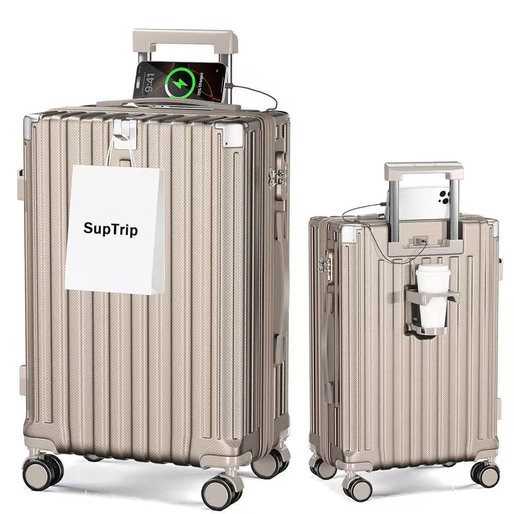 【多機能スーツケース】業界の高品質スーツケースが新登場!隠しフックやサイドフック、USBポートが付属しており、スマートフォンやタブレットなどの機器を充電でき、外出先でカバンや小物を引っ掛けるのに便利!折りたたみ可能なカップホルダーは、水、コーヒーカップ、または他の飲料容器をいつでも置くことができます。あなたの旅をより快適にします。