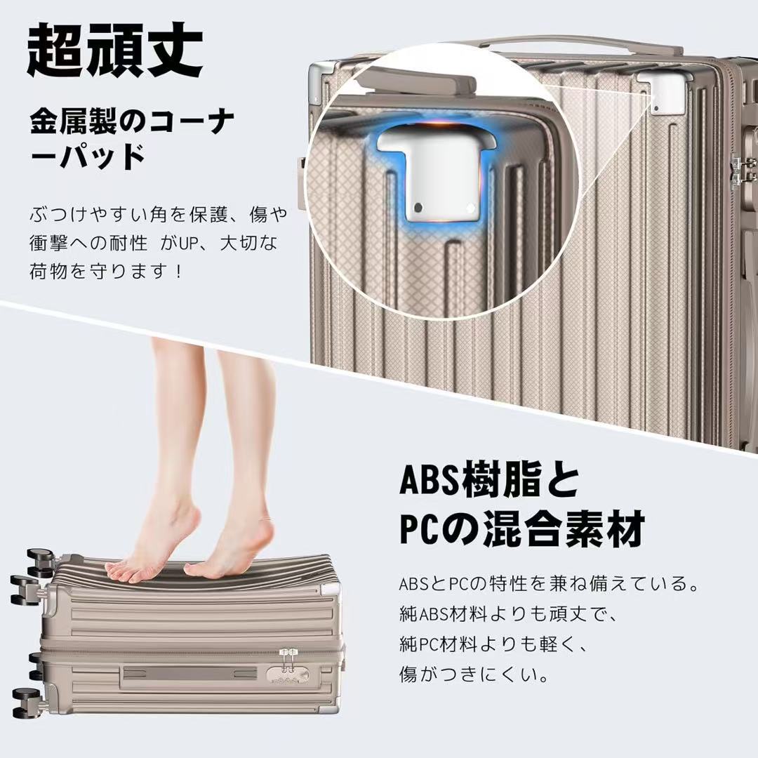 【軽量で頑丈なABS+PCボディ】 本体は軽量性と耐衝撃性に優れたABS樹脂とPCの複合素材を採用。女性でも楽に持ち上げられる重さです。表面に施された無数の微細な凹凸模様が傷つきを防止し、さらに四隅にアルミニウム合金製メタルガードを4ヶ所配置。耐衝撃性能を向上させることで、スーツケースの耐久性をさらに高めています。