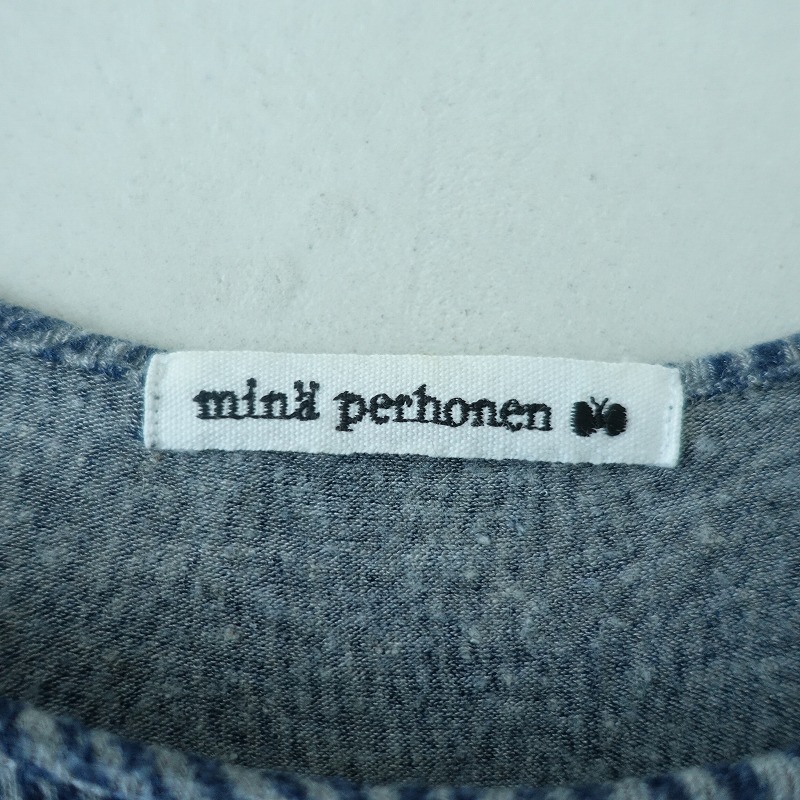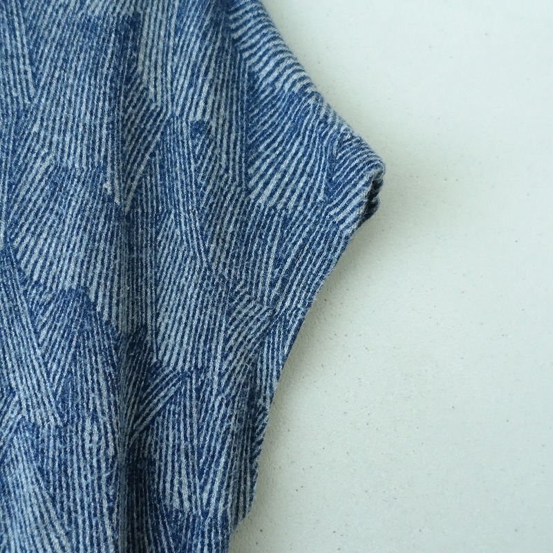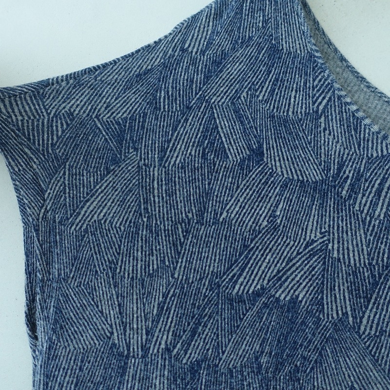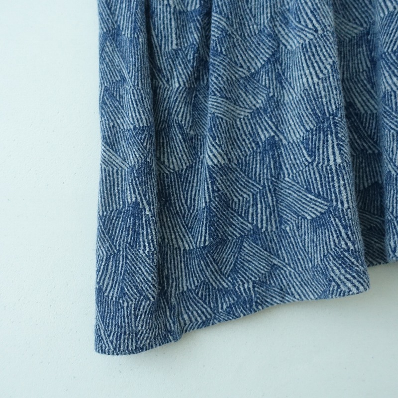 mina perhonenのripple marks ニットプリントフリルドレスです。カラーはグレー×ネイビーで、総柄プリントの微起毛薄手ニット素材で仕立てられております。ウエストはゴム&ひも入り、ウエスト周りに共布フリルがあしらわれており、両サイドにポケット付きです。 |