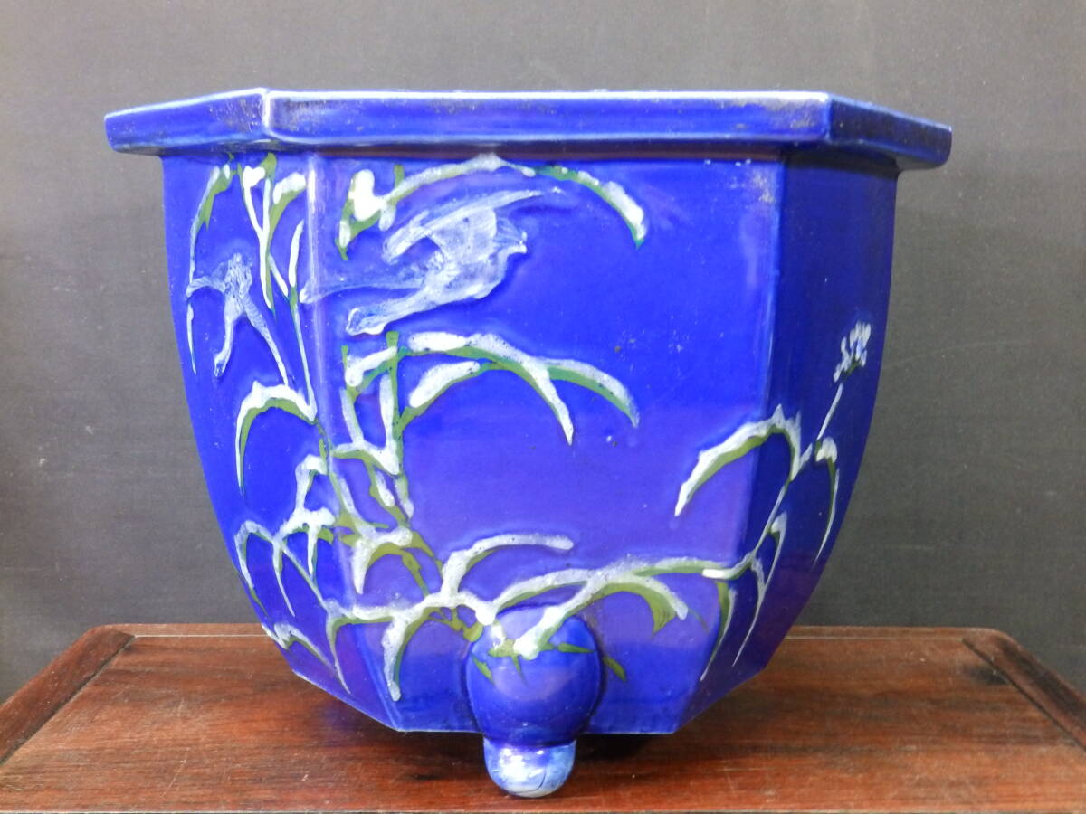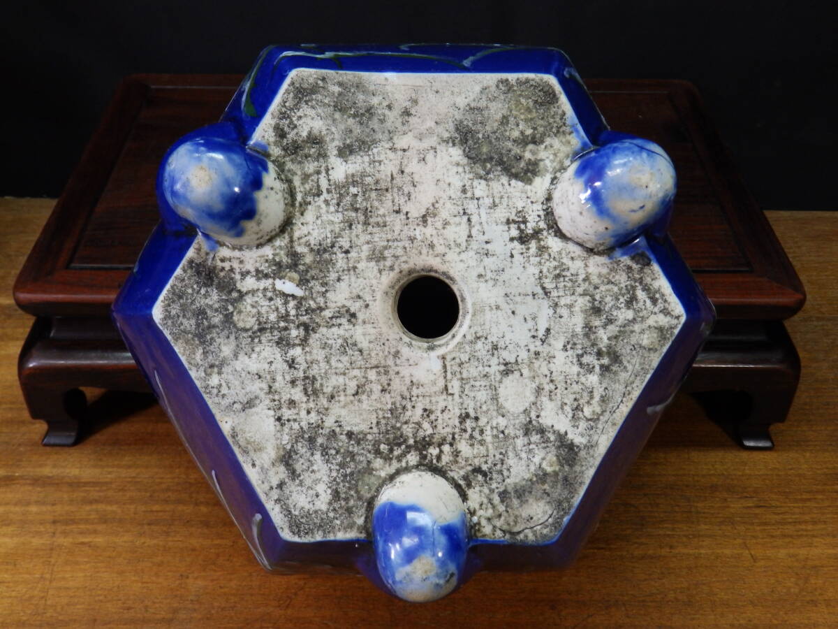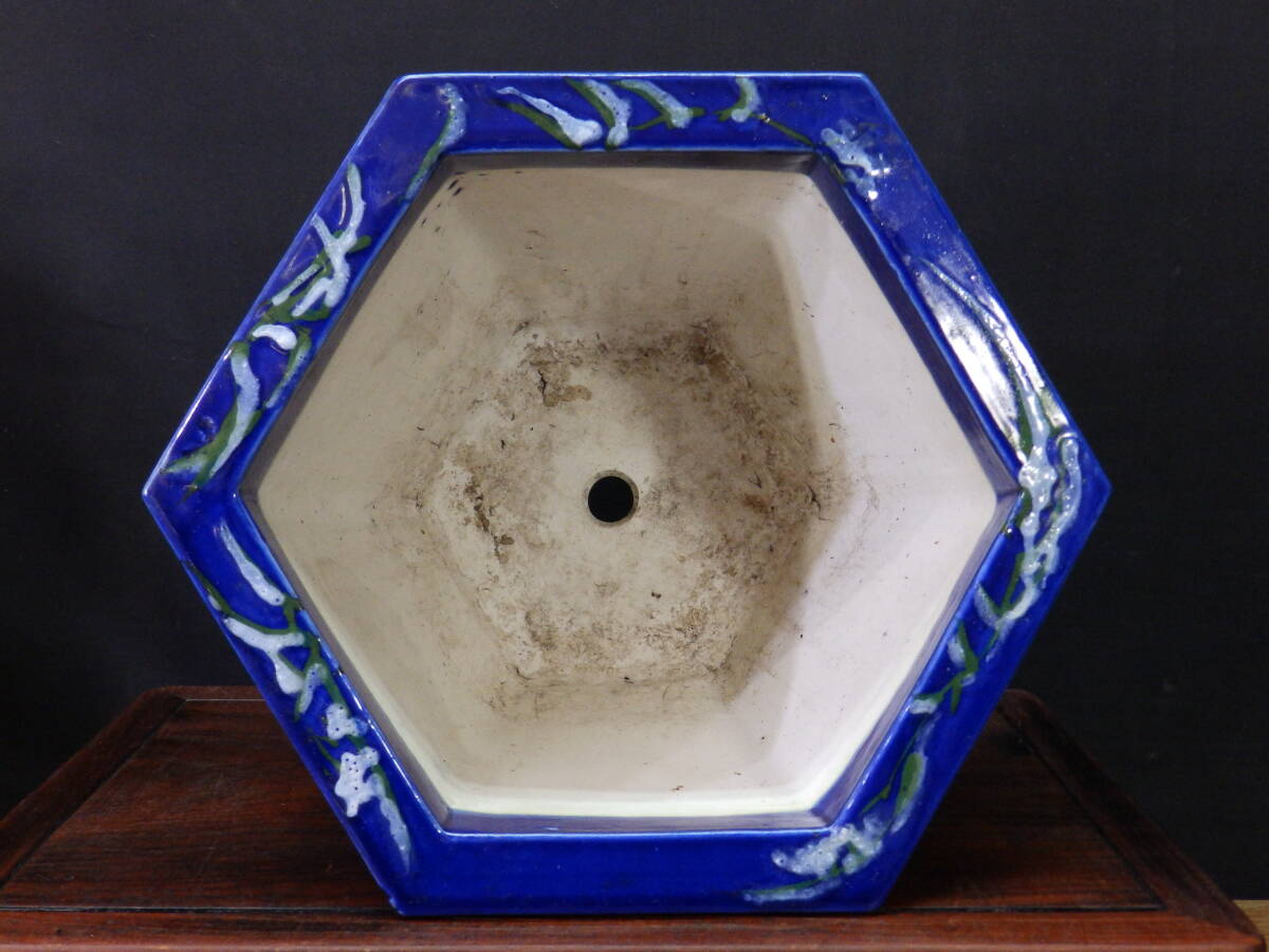 ★盆栽日和★ 和鉢 【瀬戸・尾張焼】 瑠璃釉浮絵模様入外縁六角鉢 33.5㎝