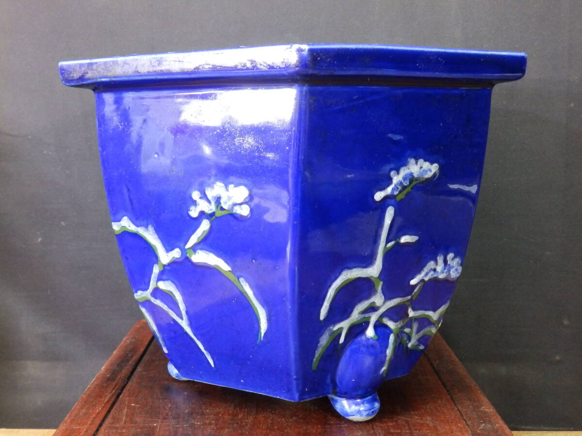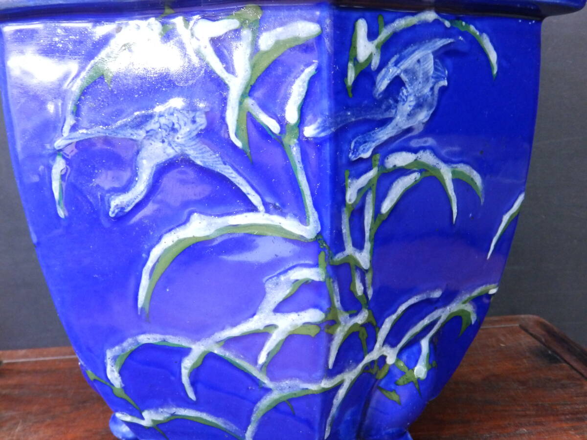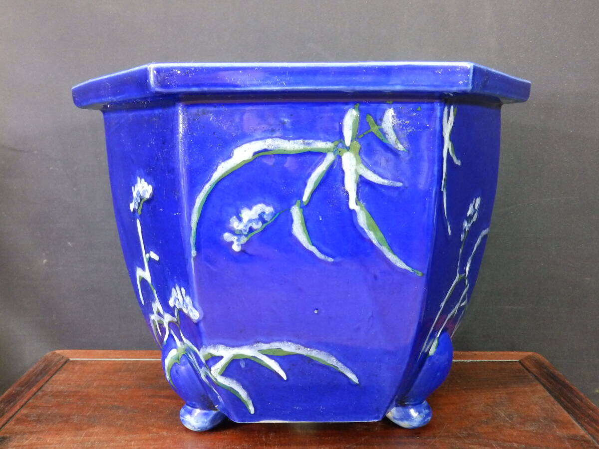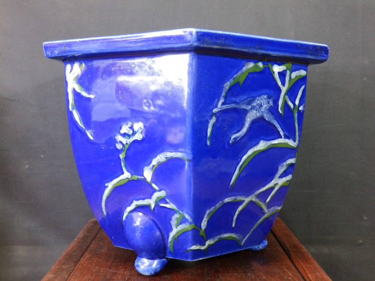 ★盆栽日和★ 和鉢 【瀬戸・尾張焼】 瑠璃釉浮絵模様入外縁六角鉢 33.5㎝