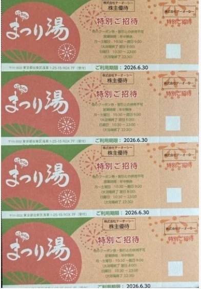 商品説明 | テーオーシー 株主優待 浅草ROX まつり湯 4枚です。 有効期限 2026年6月30日まで 在庫は2セット(8枚)ございます。 |