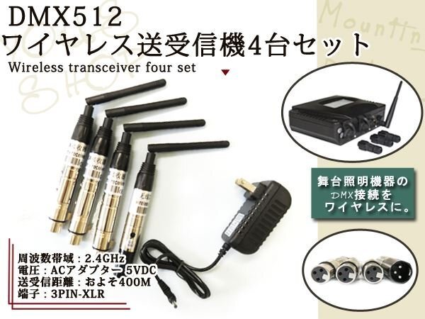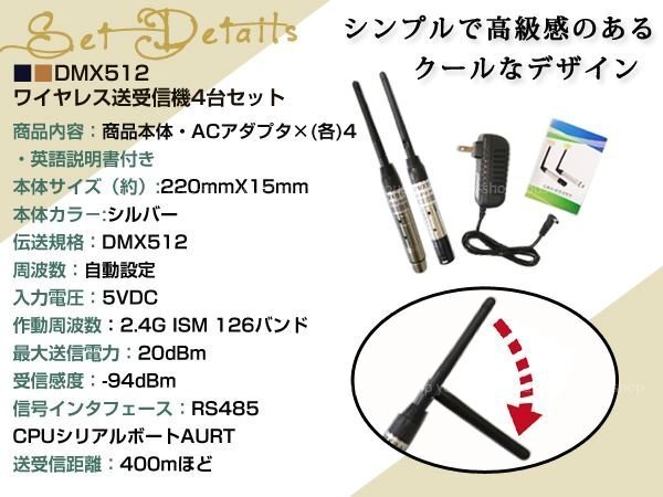 商 品 説 明2.4GHz帯を使用するDMX512トランシーバの4台セットです