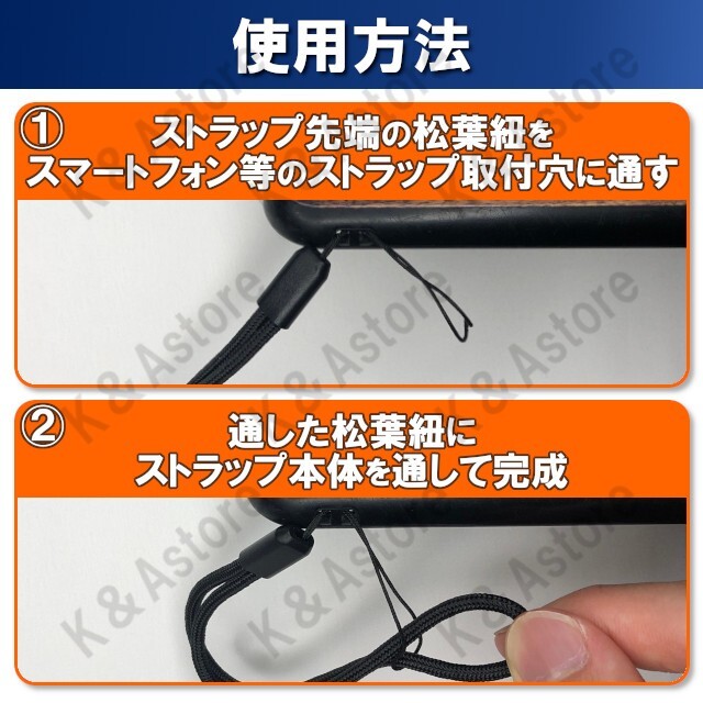 ①ストラップ先端の松葉紐をスマートフォン等のストラップ取付穴に通す