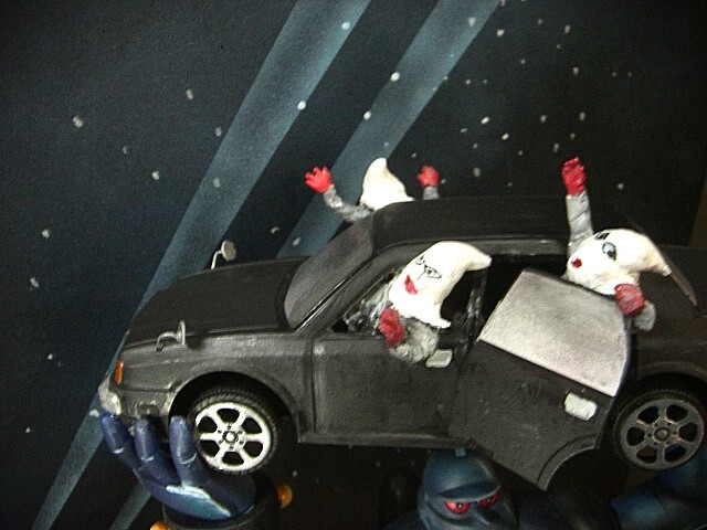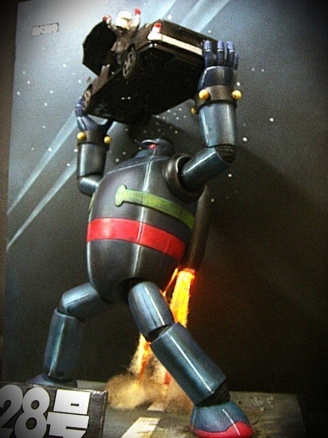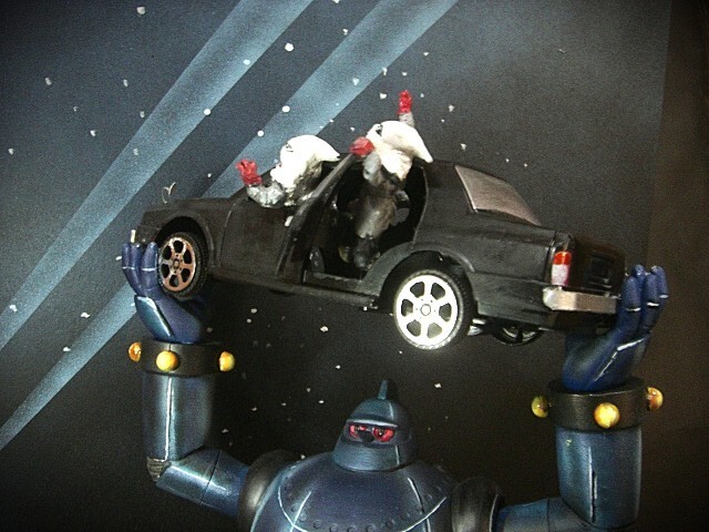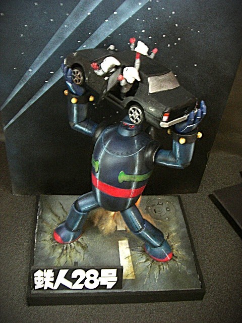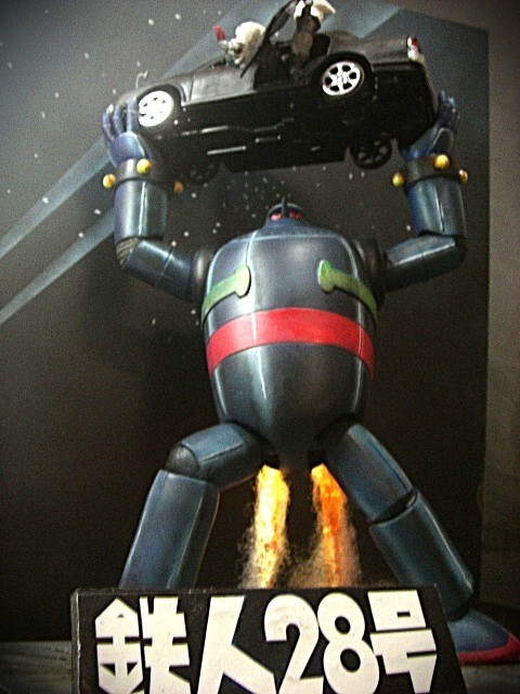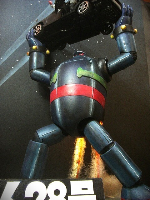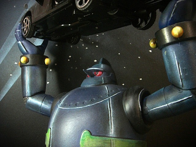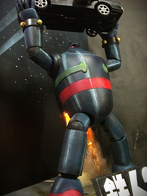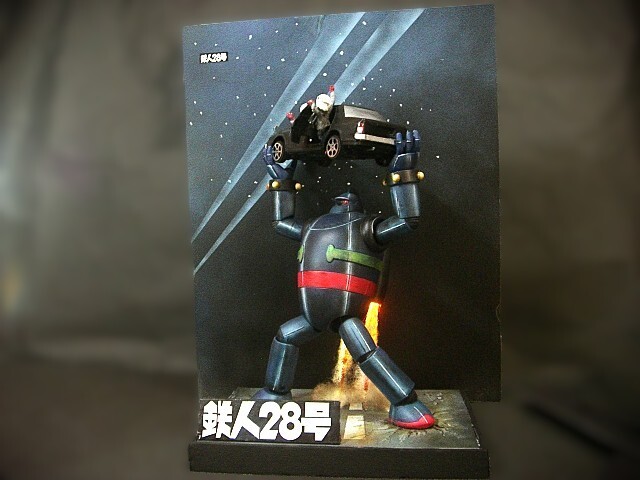 何時も多数のアクセスに心より御礼申し上げます。今回メディコムトムの鉄人28号を使用しております。覆面をした怪人が車ごと鉄人に持ち上げられるシーンを再現してみました。怪人3人は自作にて制作しております。定番の背景は選択式になっています。スダンドタイプです、鉄人のロケットにはLEDを仕込みジェット噴射を再現しております。目は光りません。
