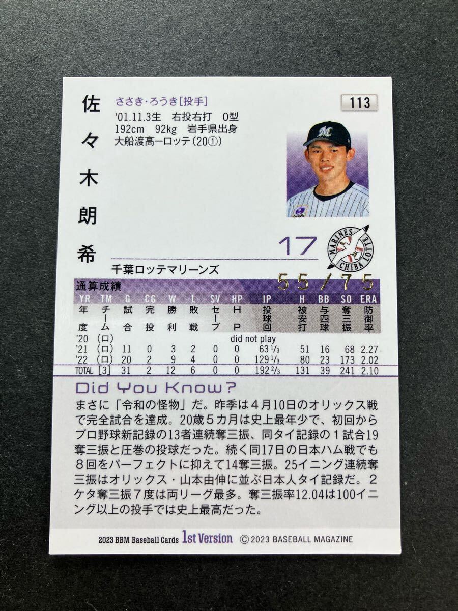 ■2023 BBM 1st 佐々木朗希 #113 55/75 ピンク箔サイン
