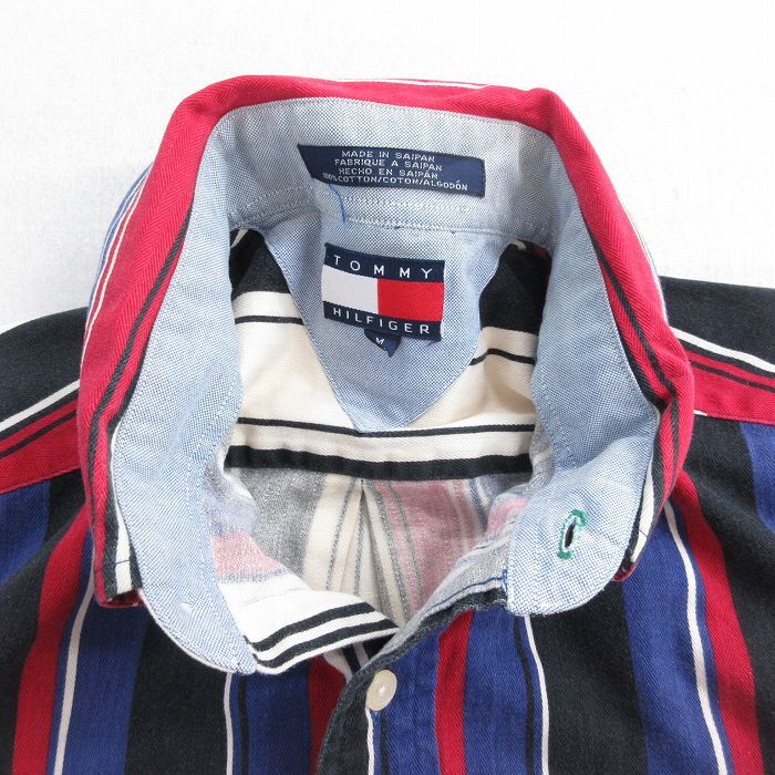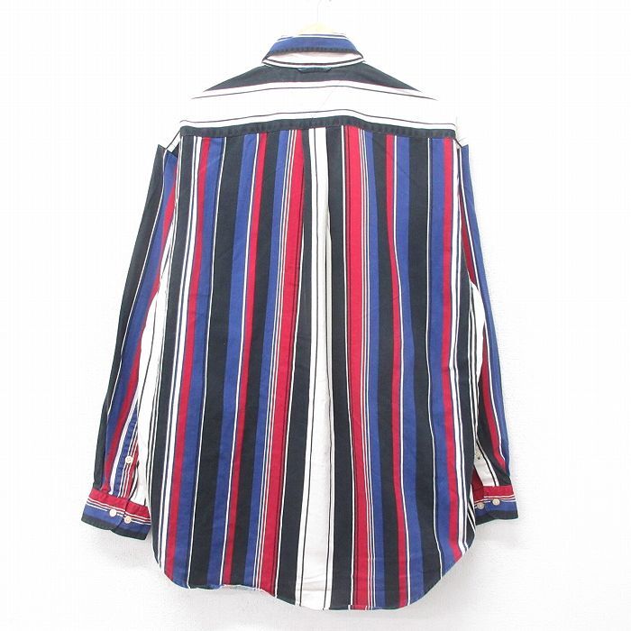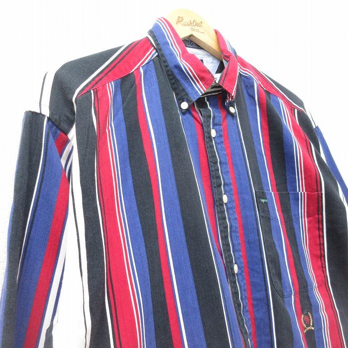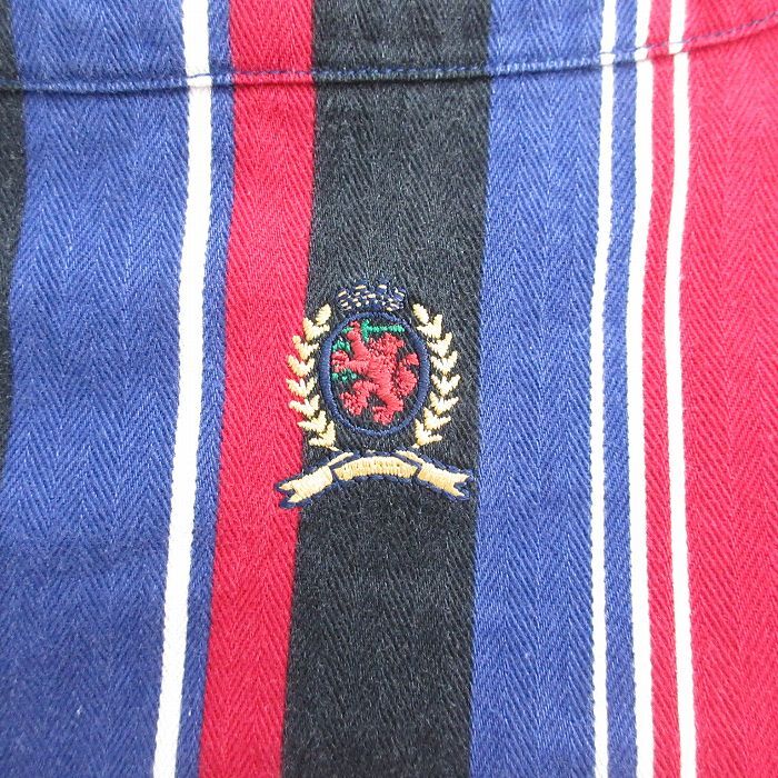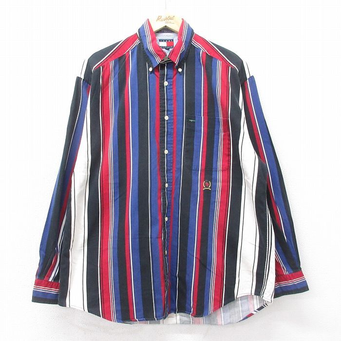 【商品名】 XL★古着 トミーヒルフィガー 長袖 ブランド シャツ メンズ 90年代 90s ワンポイントロゴ ヘリンボーン コットン ボタンダウン 黒他 ストライプ
