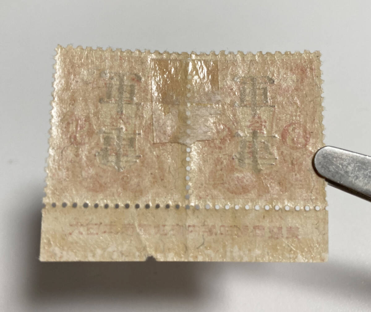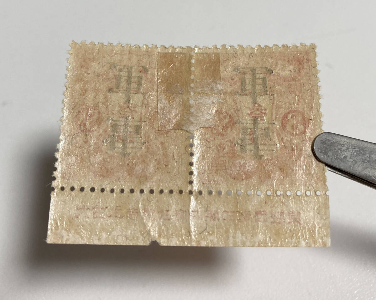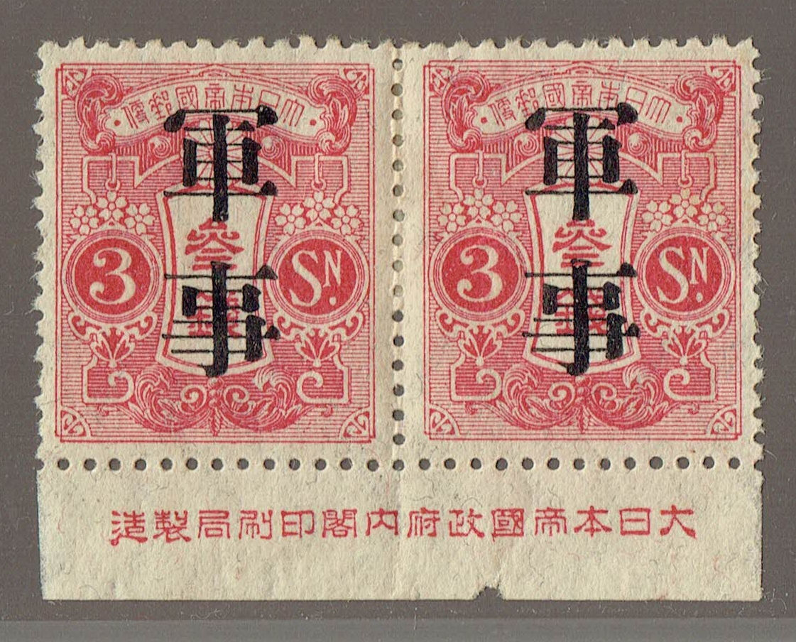 最新のビジュアル日専の評価額:130,000円。無加刷切手には白耳の内閣銘版は無く、軍事加刷切手で色調がBright rose-redのみに見られるバラエティー。
