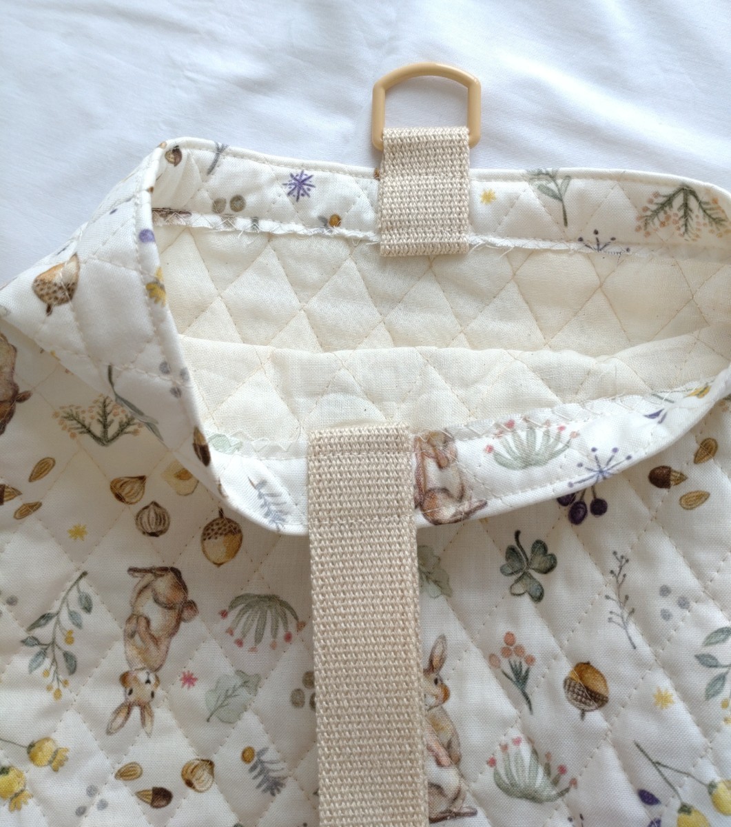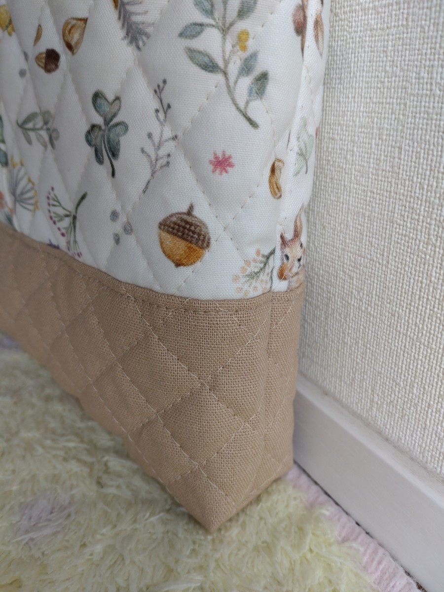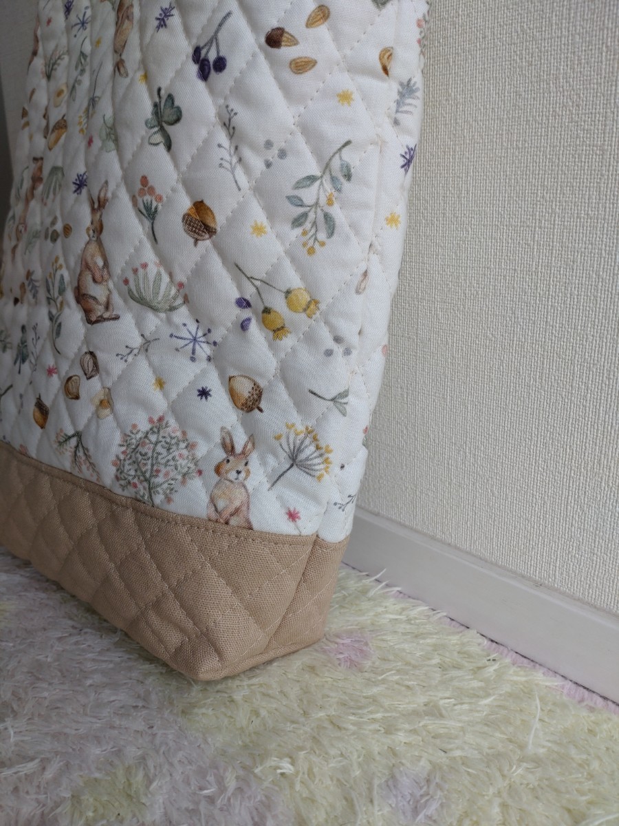 オフホワイト地に、ウサギや木の実、草花がデザインされた優しい印象のキルティング生地です。