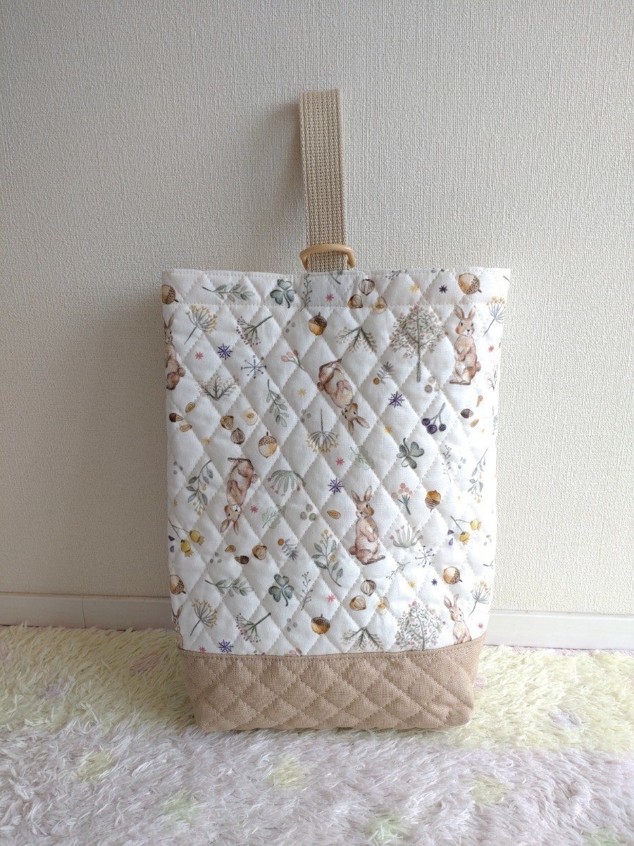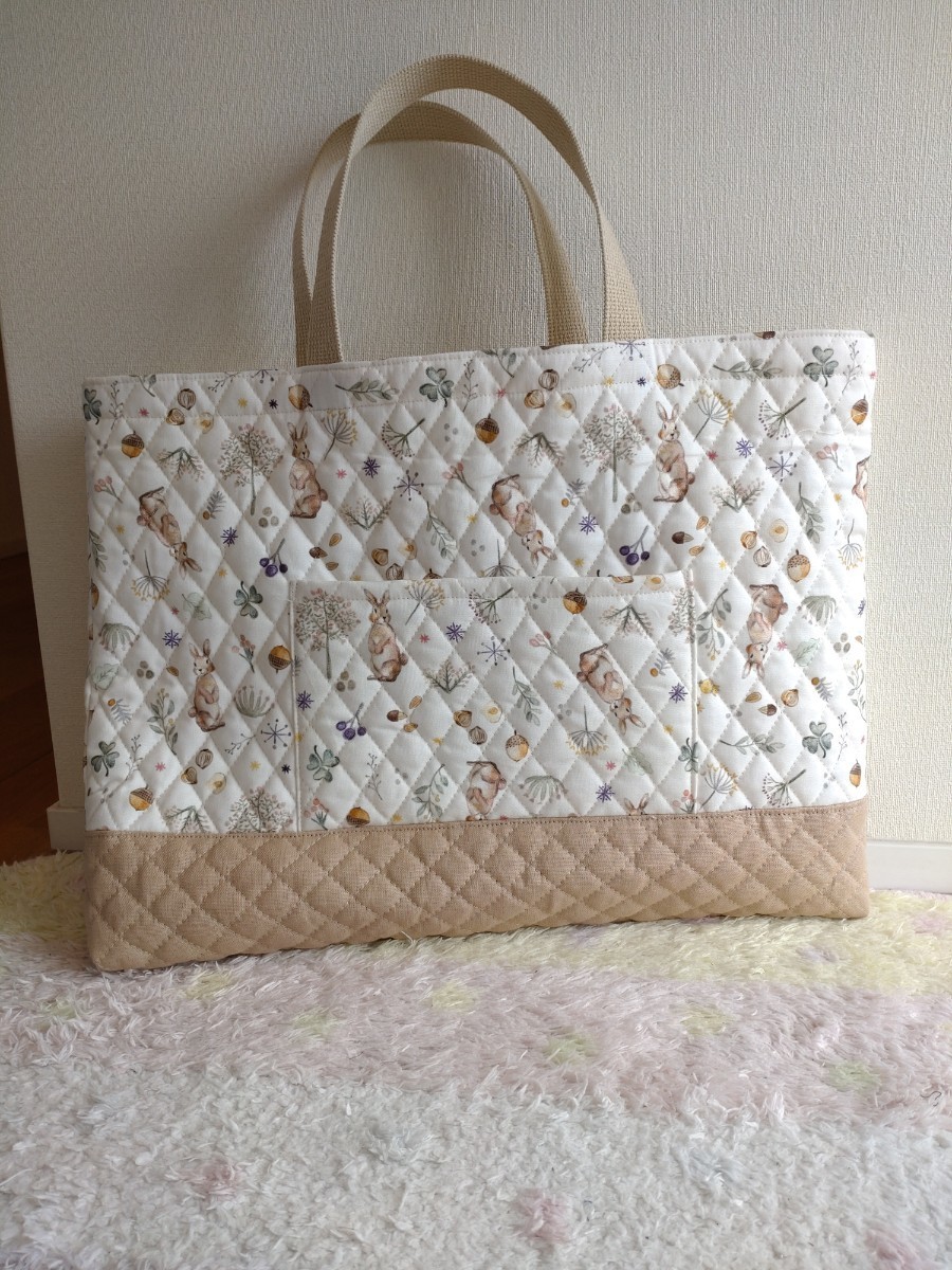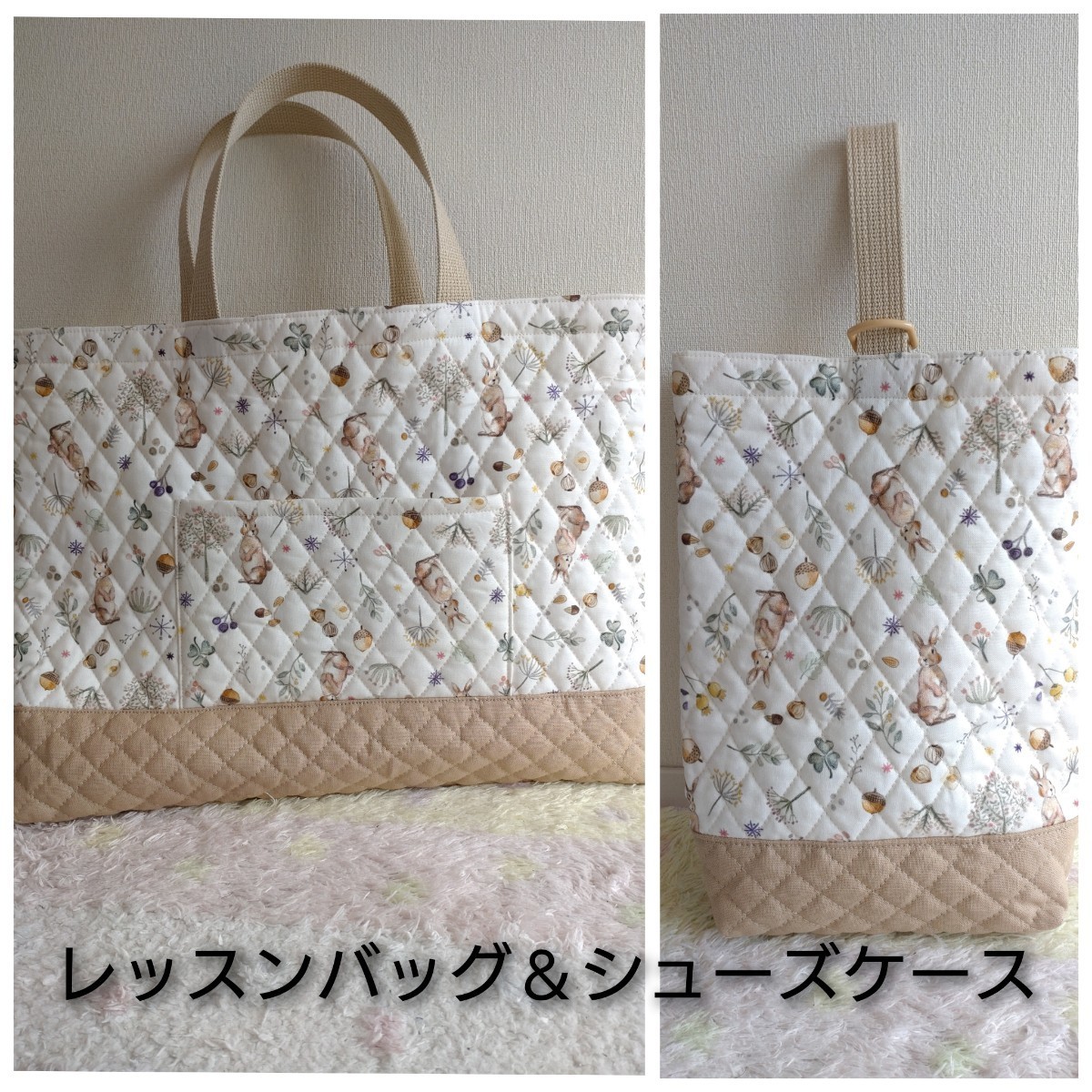 おしゃれな生地に定評があるデコレクションズさんの人気キルティング生地「ミルキーラビット」を使用したハンドメイドのレッスンバッグとシューズケースの2点セットです