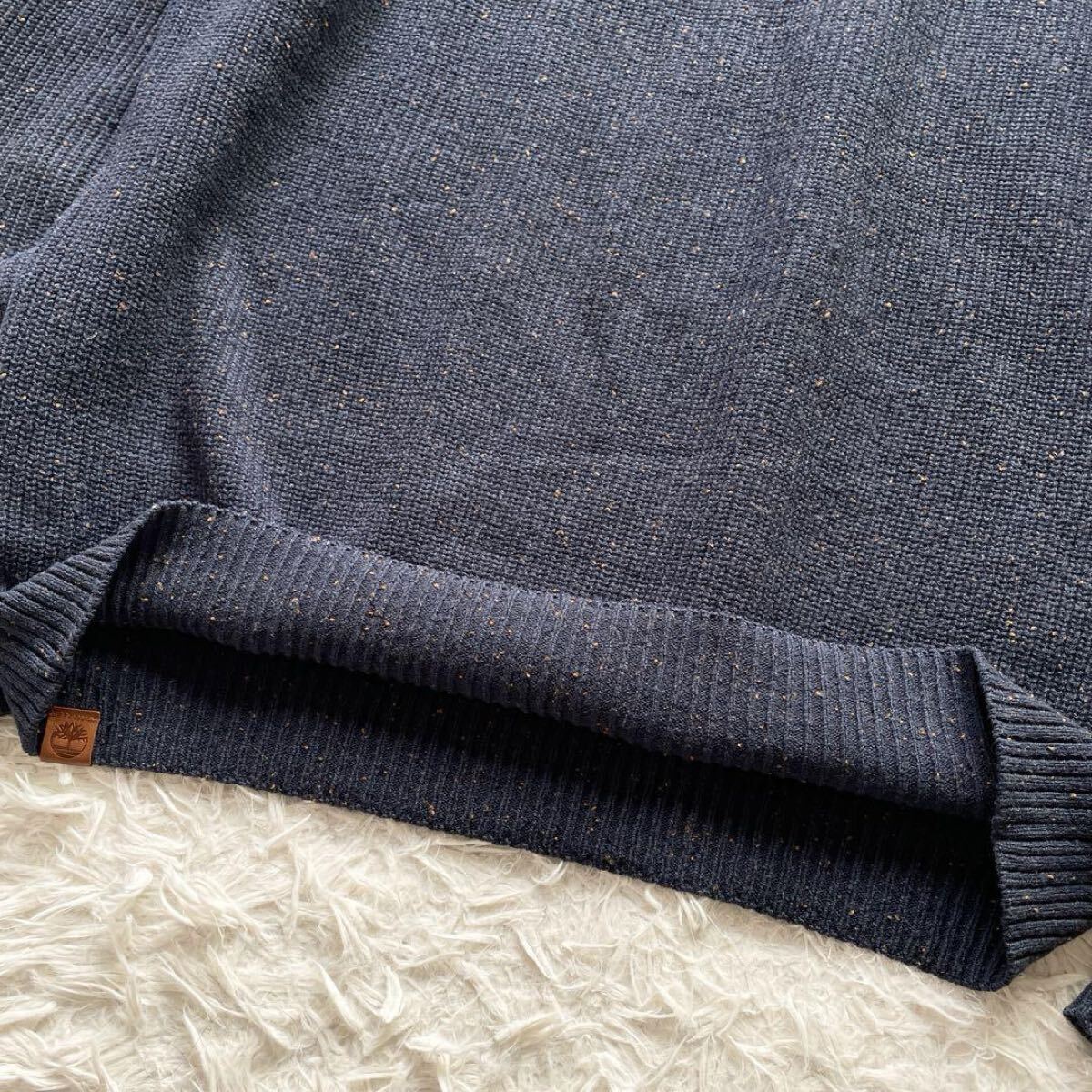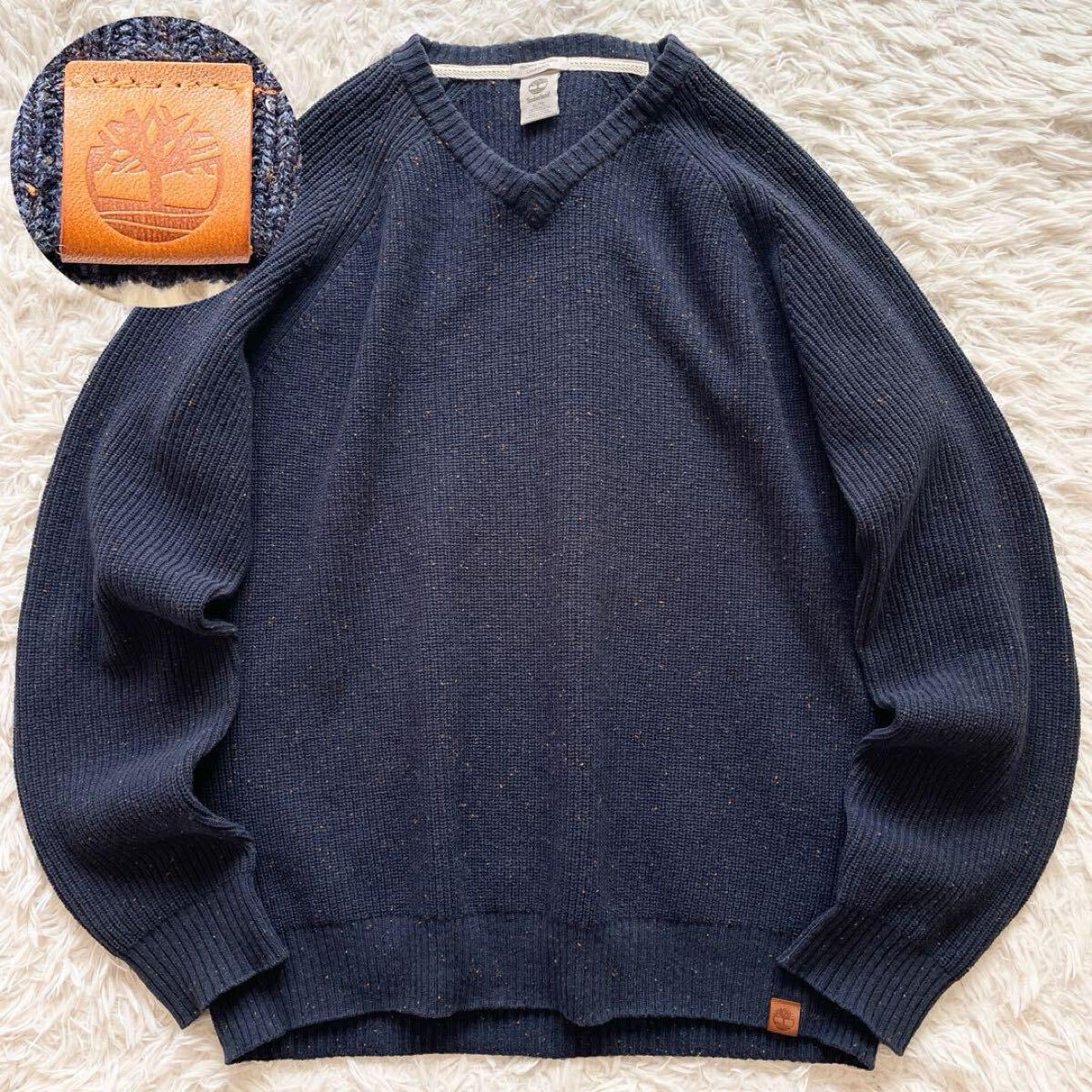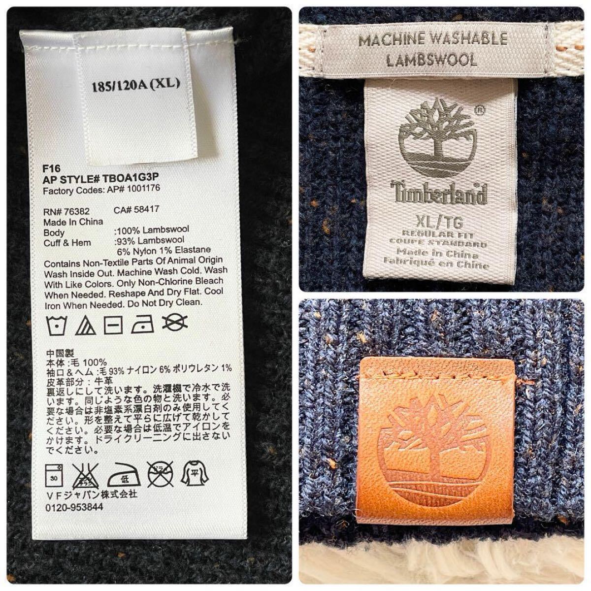 美品 XLサイズ Timberland ラムウール ニット 本革 レザーロゴパッチ ウォッシャブル ネップ ラグラン袖 ネイビー系 メンズ ティンバーランド セーター 紺系 洗える アウトドア アメカジ