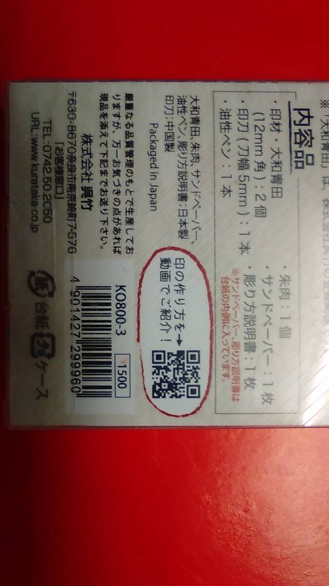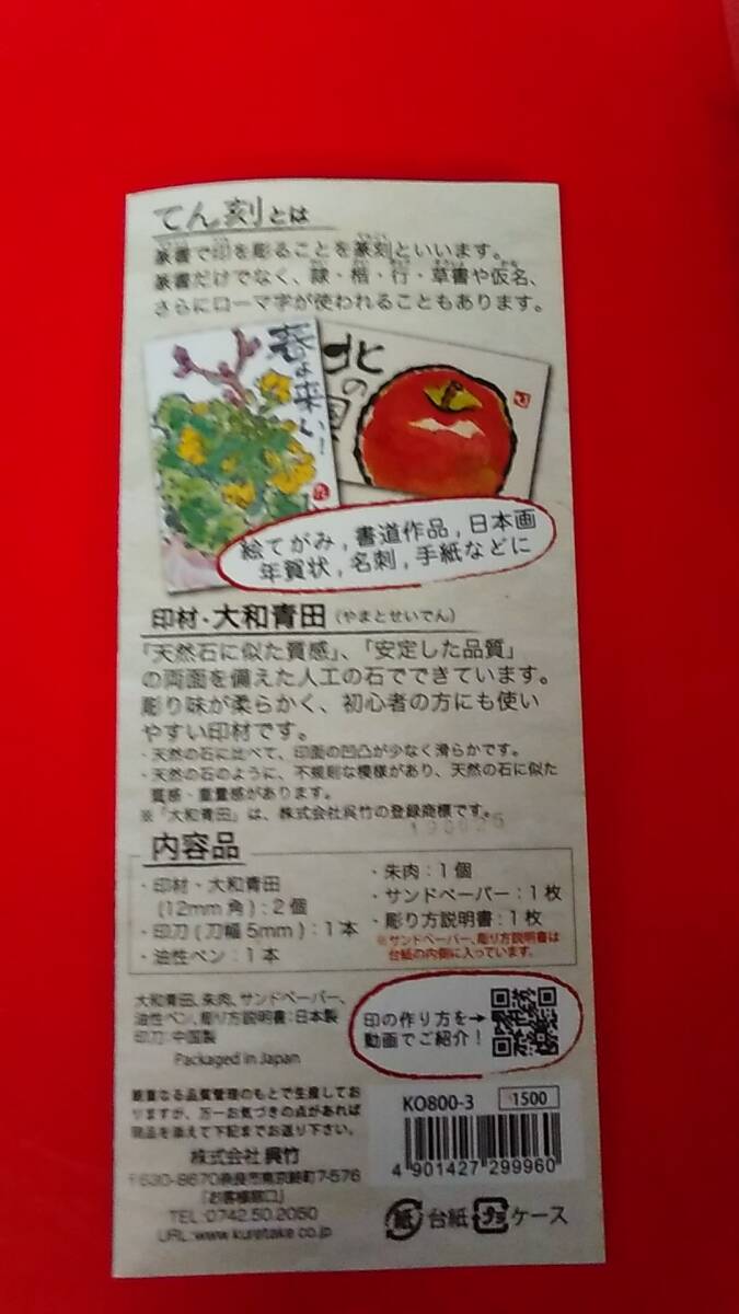 書道専門家向 呉竹篆刻セット  初心者でも使いやすい柔らかい彫り味の印材 ・大和青田と印刀、朱肉、油性ペンをセットにしたすぐにてん刻がはじめられるセット。天然の石に比べて、印面の凹凸が少なく滑らか【サイズ】75×175×13mm【内容品】印材・大和青田(12㎜角)2個/印刀/油性ペン/朱肉/サンドペーパー/彫り方説明書 発送は定形外発送手数料250円 レターパックライト430円 レターパックプラス600円