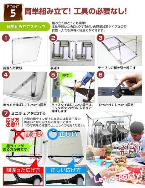 テーブルの中に椅子を収納することで、車のトランクに入れる時や持ち運びの時に便利です!! 組み立てはとっても簡単! 開いてロックするだけの簡単設置タイプなので女性一人でも気軽に組立てができます。 高さは「ハイスタイル」「ミドルスタイル」「ロースタイル」の3段階調節。 お好みや用途に合わせて使い分けることができる嬉しい仕様♪ 天板中心部にはパラソル用ホールがあるので、ベランダやテラスでの使用にもおススメです♪ キャンプ、バーベキュー、お花見などにとても便利! 【商品仕様】 折りたたみ式 テーブルサイズ(約):幅120×奥行60×高さ55cm/62cm/70cm ※高さ3段階調節 カラー:ホワイト 収納サイズ(約):幅60×奥行7×高さ60cm チェアサイズ(約):幅33×奥行29×高さ35cm パラソル用ホール直径サイズ(約):26mm 耐荷重(約):テーブル/25kg、チェア/70kg 重量(約):6.7kg 材質:アルミ、MDF(耐熱・耐水加工)、ポリエステル、スチール 【商品内容】 ・テーブル ×1 ・チェア ×4 【注意事項】 ・海外製品で、簡易梱包での輸入のため風防に擦れや多少の小キズなどがある場合がございますが、商品自体には問題ありませんのでご了承下さい。 ・商品は、モニターによって色合いが異なって見える場合があります。 ・仕様・デザインは改良のため予告なく変更することがあります。 【その他ラインナップ】 ・90cm(ベンチ付き) ・90cm(4色選択・ベンチなし) ・120cm(イス付き) ・120cm(4色選択・イスなし) ・135cm(BBQタイプ) ・180cm(4色選択・イスなし) ・240cm(4色選択・イスなし) |