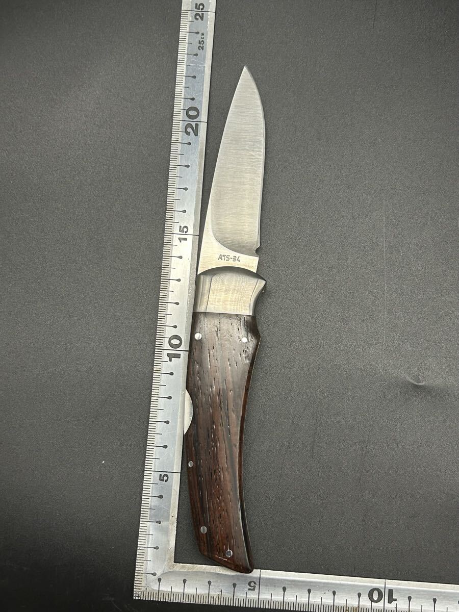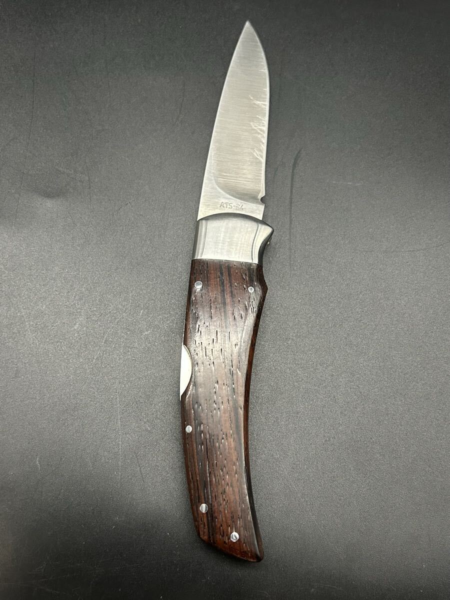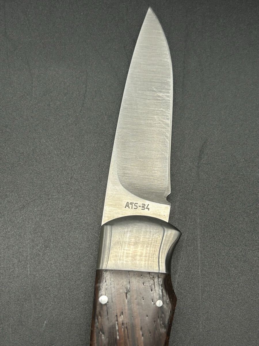 ブレード素材ATS-34は、日立金属開発の特殊ステンレス鋼で、耐熱性・耐腐食性が強く、強固なナイフが作れる鋼材として有名です。素材自体が高価なため高級ナイフの素材として主にカスタムナイフメーカーで採用されています。