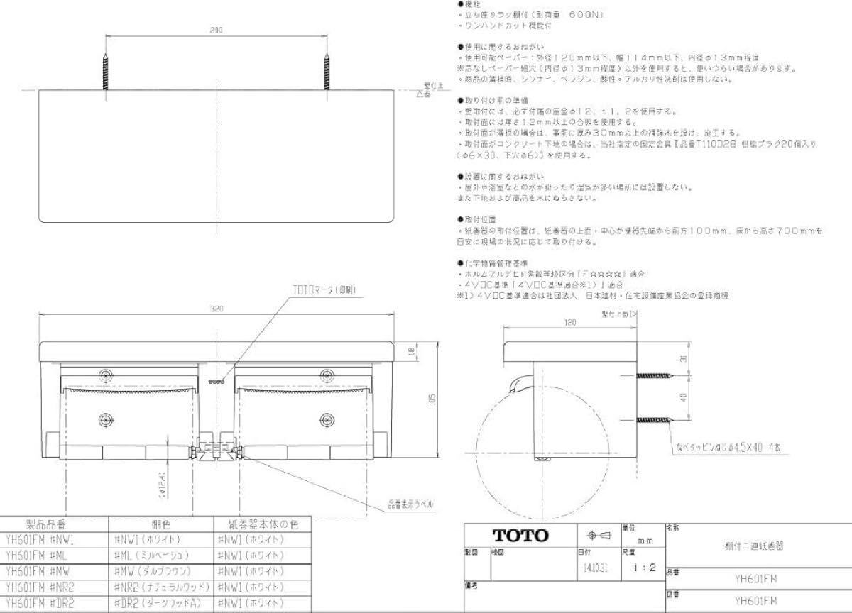 商品名 : TOTO 棚付二連紙巻器 YH601FM#NW1